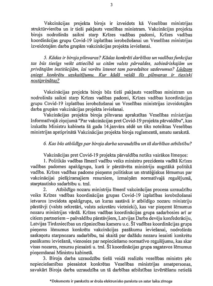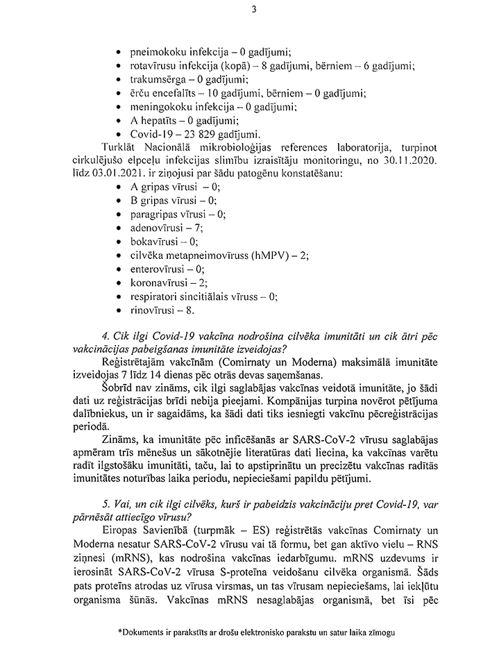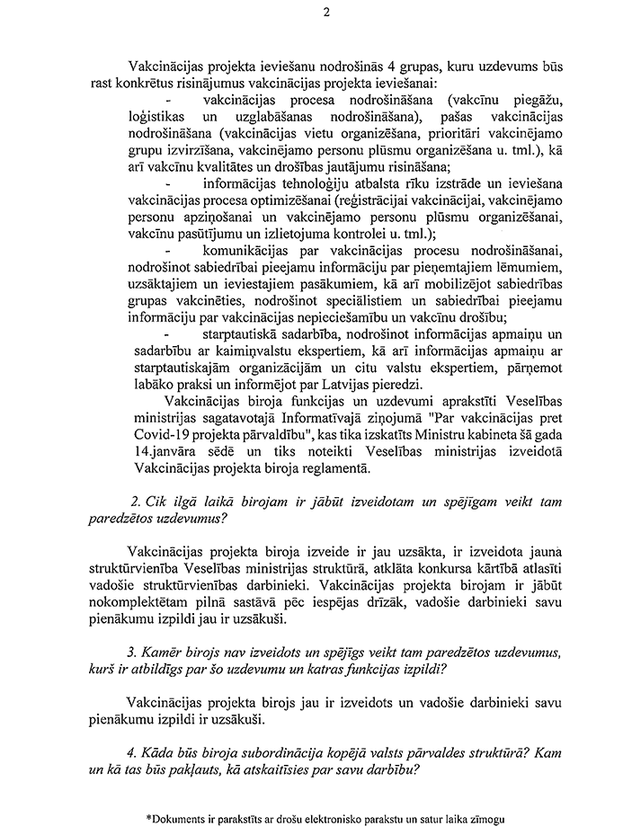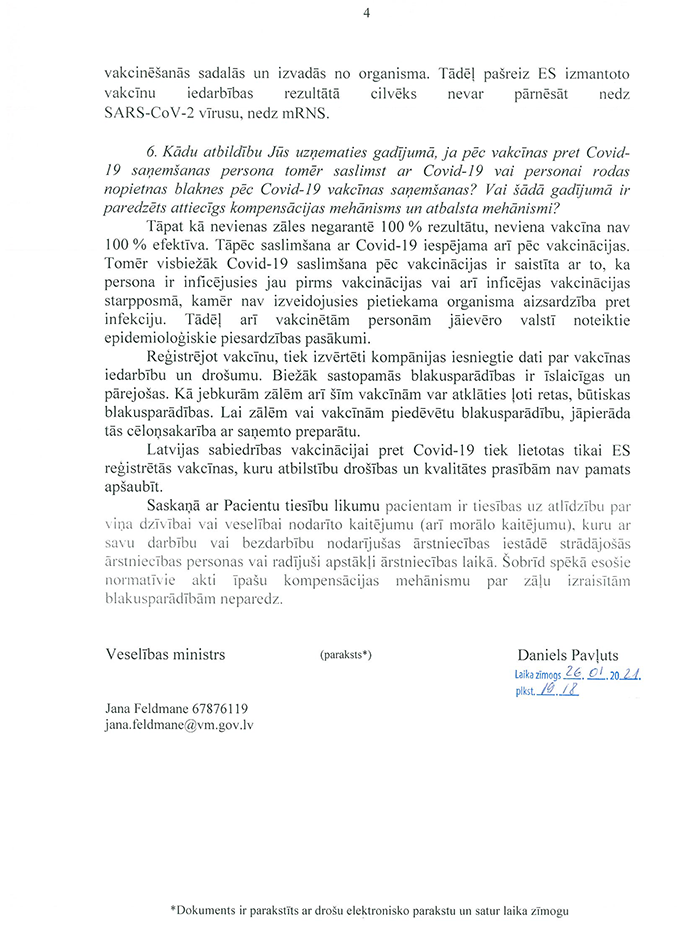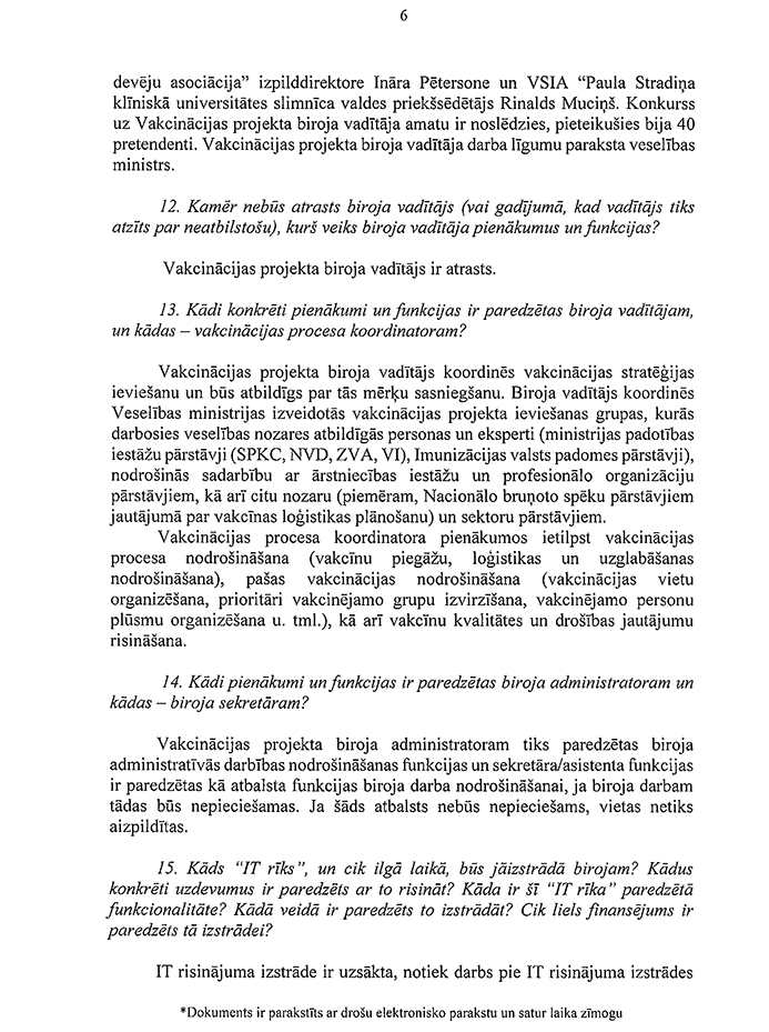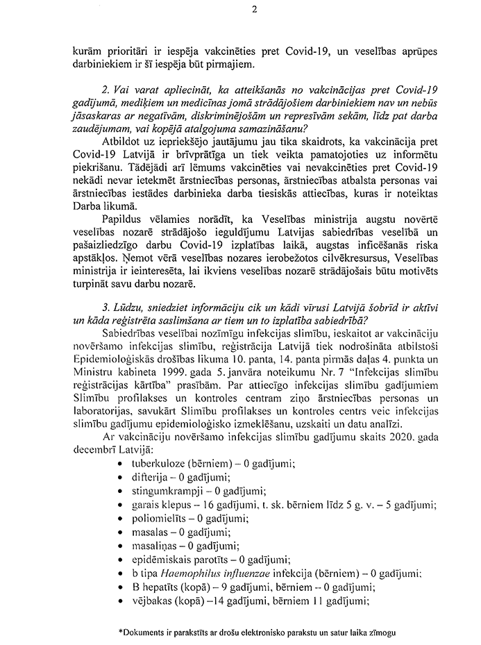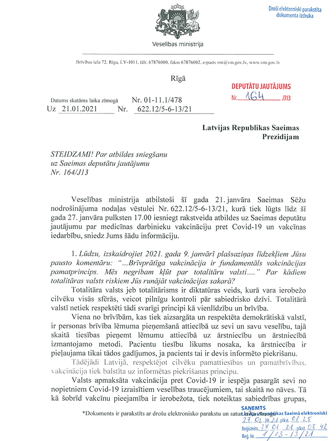 Un vēl es vēlos piebilst to, ka pie mums ir vērsušies arī studenti – medicīnas studenti –, kuri ir ļoti nobažījušies par tādām dīvaina veida anketām, kuras tiek izplatītas viņu starpā. Viņus aicina anketas aizpildīt – ierakstīt savu vārdu un uzvārdu un atbildēt uz jautājumu: vai jūs piekrītat vai nepiekrītat vakcinēties, lai turpinātu... lai atsāktu klātienes darbības? Un, ja tu nevēlies vakcinēties, tad jānorāda arī iemesls, kāpēc tu to negribi.