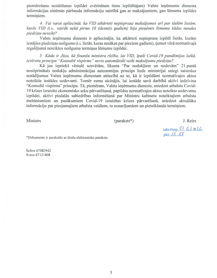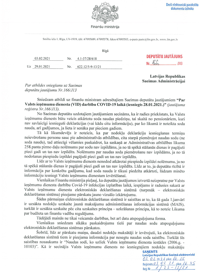 Deputāti Edgars Tavars, Raimonds Bergmanis, Janīna Jalinska, Jānis Vucāns un Armands Krauze ir iesnieguši jautājumu finanšu ministram Jānim Reiram "Par Valsts ieņēmumu dienesta (VID) darbību COVID-19 laikā". Šo jautājumu Prezidijs nodod ministram atbildes sniegšanai.