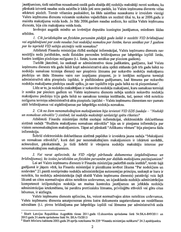 Es šodien pat negribu runāt par ekonomisko sadaļu vai par atbalstu uzņēmējiem. Es pat negribu runāt par Valsts ieņēmumu dienesta ierēdņu rīcību, kuri šobrīd vēršas pie cilvēkiem... pat pie pensionāriem vēršas ar 13 gadus veciem lēmumiem, kurus paši iepriekš bija atcēluši, – vēršas, lai piedzītu no viņiem nepiedzenamo, uzlikdami soda naudas pensijas apmērā.