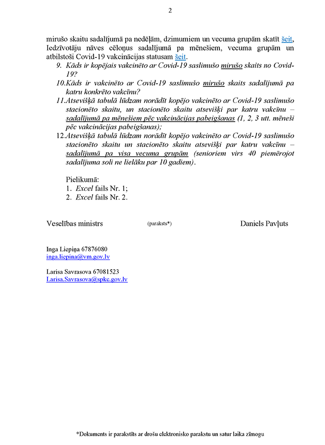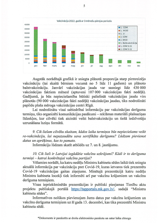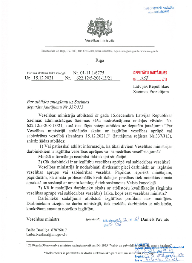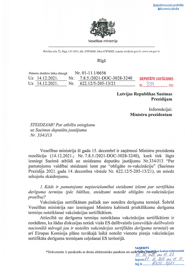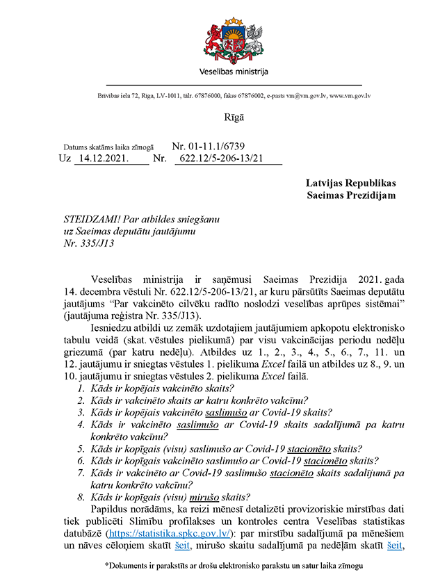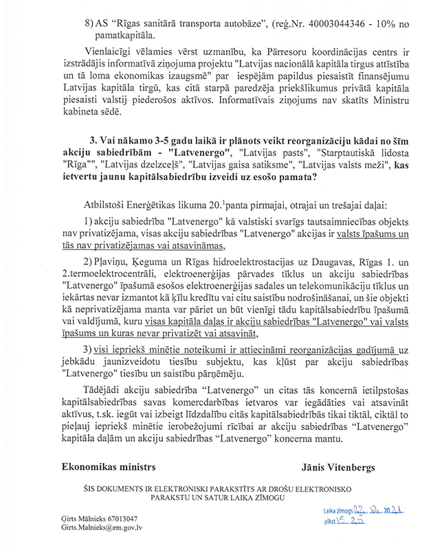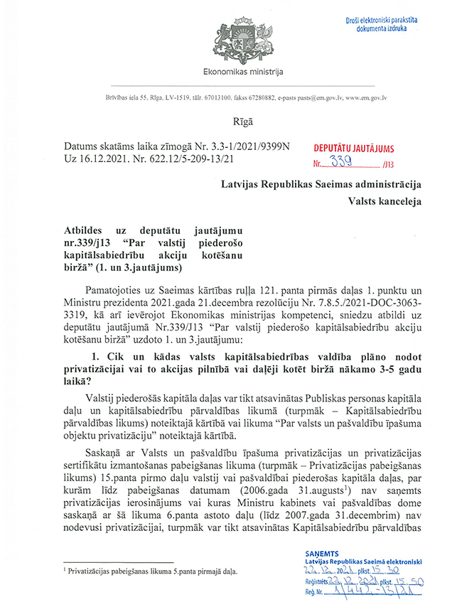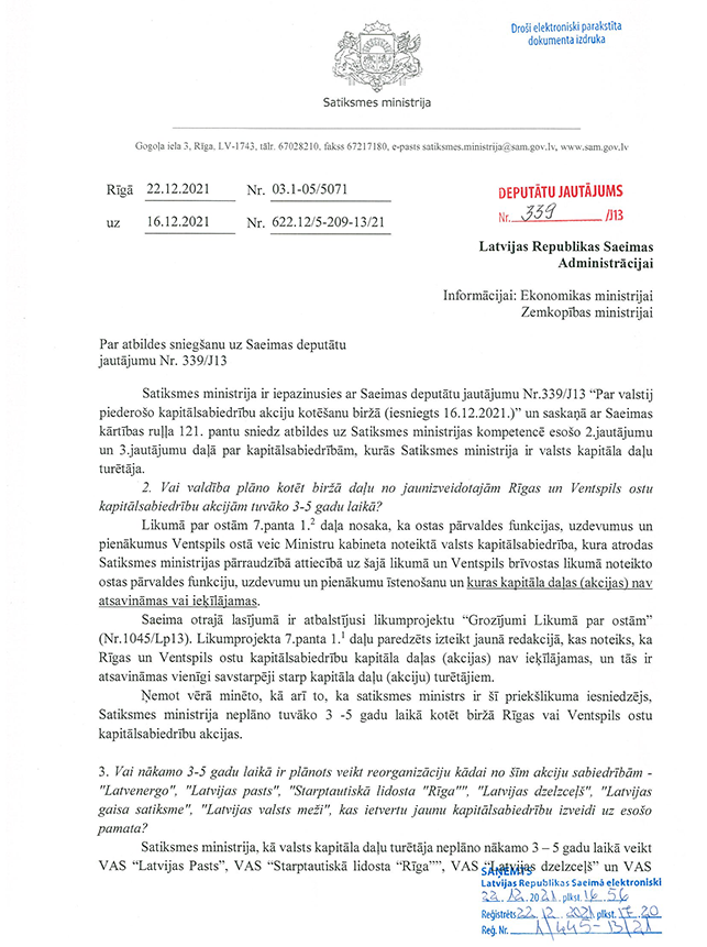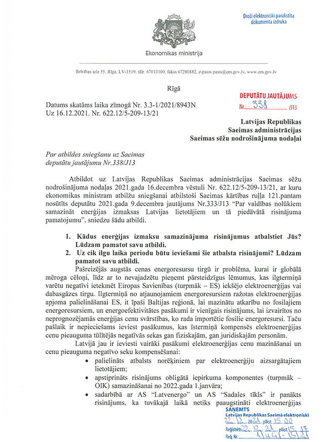 Vēl vēlos jūs informēt par deputātu iesniegto jautājumu.