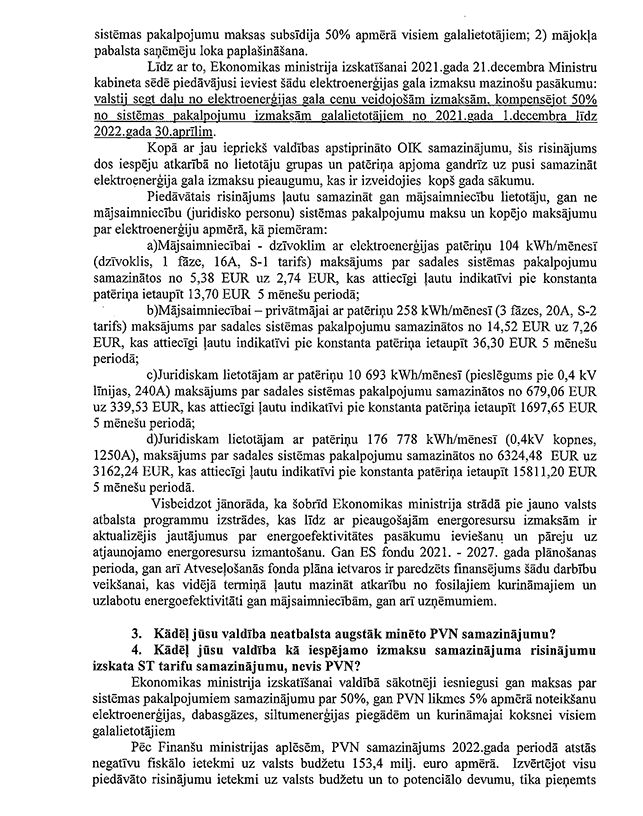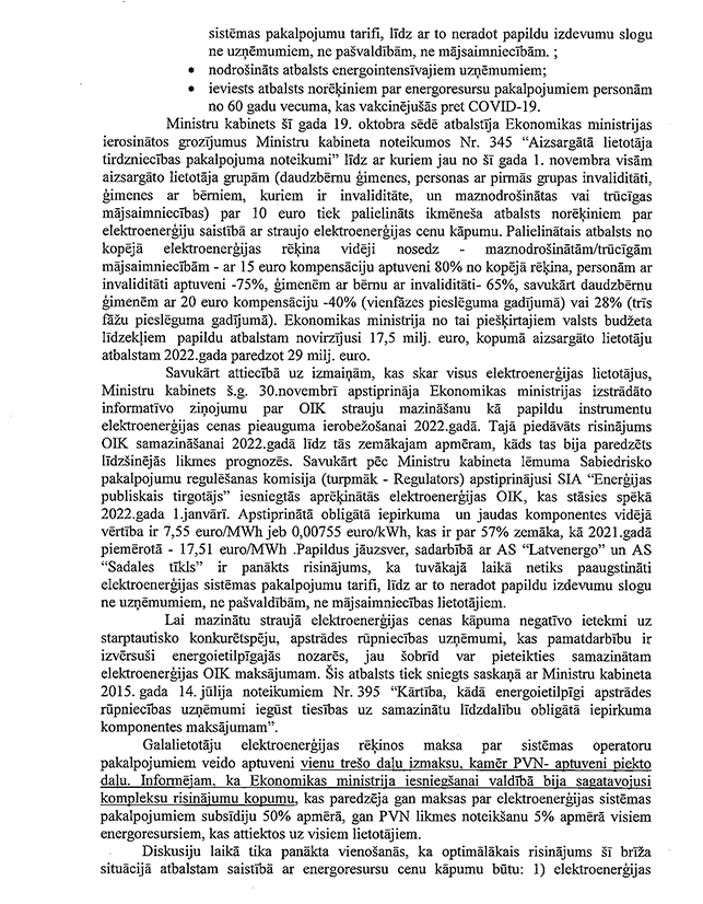 Papildus precizējām likuma 32.2 panta 4.8 daļas redakciju, likumā nosakot, ka līdzekļus, kas ir iegūti, izsolot 32.2 panta trešajā daļā minētās emisijas kvotas, var izmantot, lai kompensētu elektroenerģijas sistēmas pakalpojumu izmaksas. Savukārt kompensācijas apmēru – 50 procentus – katram galalietotājam par konkrēto periodu no šā gada 1. decembra līdz nākamā gada 30. aprīlim mēs iekļaujam pārejas noteikumu 69. punktā. Un, ņemot vērā šo, mēs izveidojām alternatīvu komisijas likumprojektu. Ja savukārt mēs par šo runājam pēc būtības, tad ir tā, ka par to, kas šobrīd notiek ar enerģijas cenām pasaulē, droši vien man nav lieku reizi jāstāsta. Un šis likumprojekts ir radīts, lai mēs mazinātu šo cenu kāpumu patērētājam.