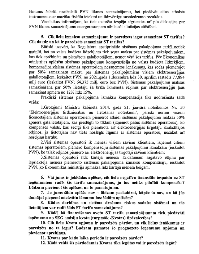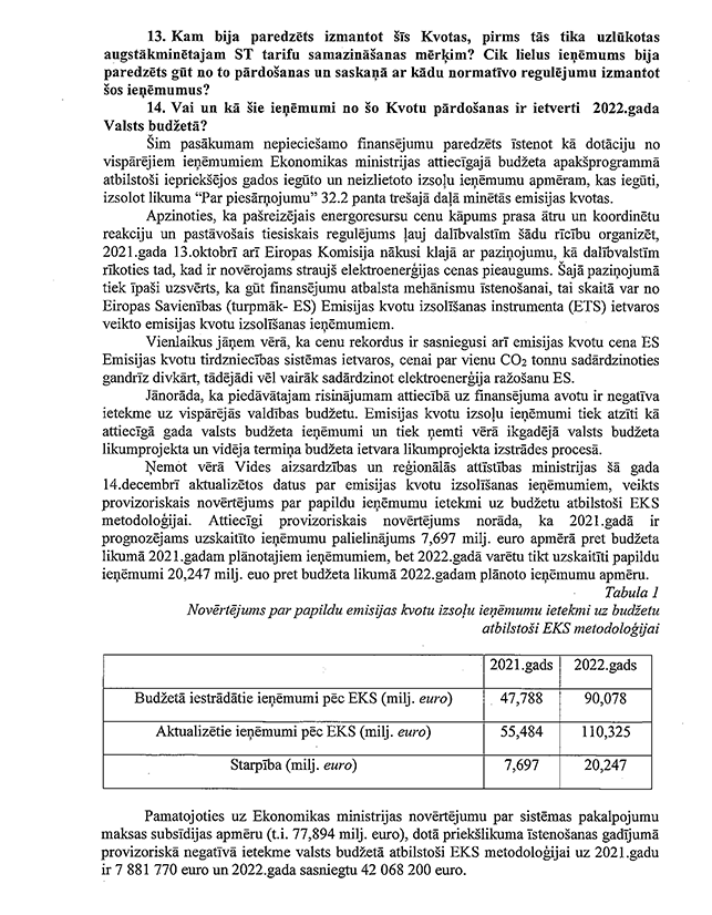 Otra lieta. Ja mēs runājam par šiem kvotu ieņēmumiem, šiem emisiju tirdzniecības kvotu ieņēmumiem, tad arī šinī ziņojumā ir teikts, ka pašreizējā situācijā... ko saka Eiropas Komisija par plānotajiem... lielākos šos kvotu ieņēmumus var izmantot, lai finansētu neparedzētas vajadzības mērķtiecīgam sociālajam atbalstam. Taču, kā mēs zinām, tas, kas tiek veidots... šis sadales tarifa atbalsts tika veidots... un valdība atteicās no PVN atbalsta, tāpēc ka viņi vēlējās palīdzēt tieši uzņēmējiem. Mēs nerunājam šeit par sociālo atbalstu, šis ir daudz plašāks nekā sociālais atbalsts – tas, par ko mēs pašlaik lemjam.