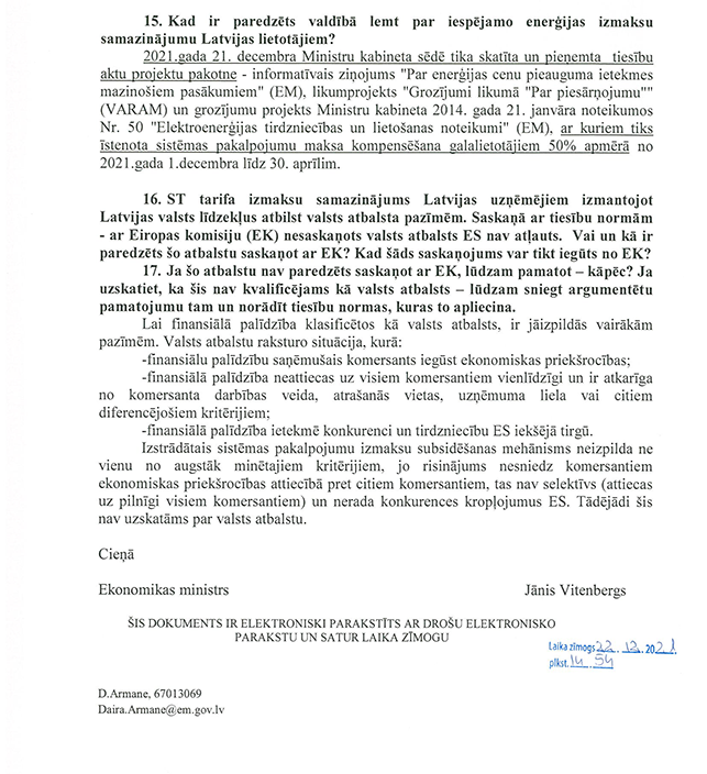 Vēl viena lieta, par ko mēs runājam... kā atruna, ka... Labi, mēs to varam neuzskatīt kā valsts atbalstu, tik tiešām mēs nedebatējam par to – tas ir atbalsts vai nav atbalsts –, jo tā definīcija, kas tiek piedāvāta, ka vispārēji pasākumi, kas vienlīdz palīdz visiem enerģijas patērētājiem, nav valsts atbalsts... Bet jautājums ir, vai šī sadales tarifa samazināšana vienlīdzīgi palīdz visiem enerģijas patērētājiem, vai Eiropas Komisija no savas puses to nevar interpretēt savādāk, jo pēc būtības atbalsts jau nebūs vienāds visiem, katrs saņems atšķirīgu atbalsta apjomu atkarībā no tā, kāda katram ir sadales tarifa struktūra, tas nebūs vienāds visiem.