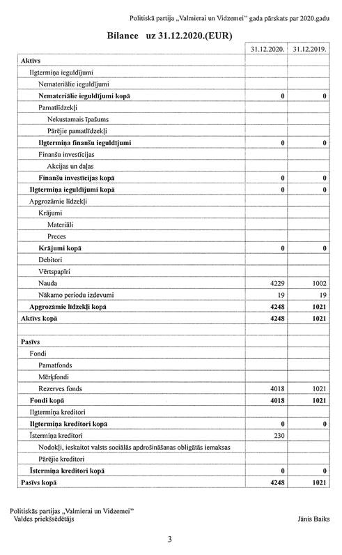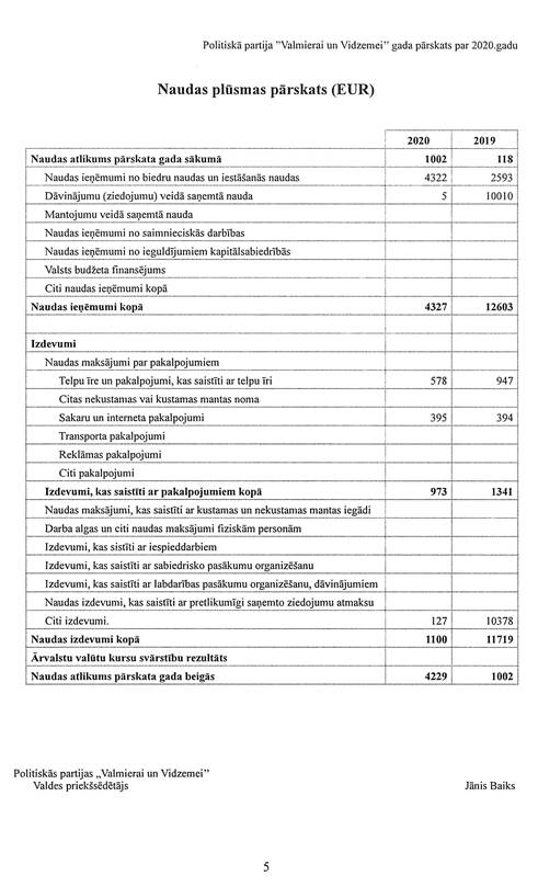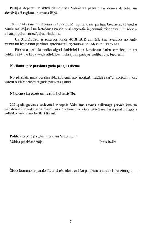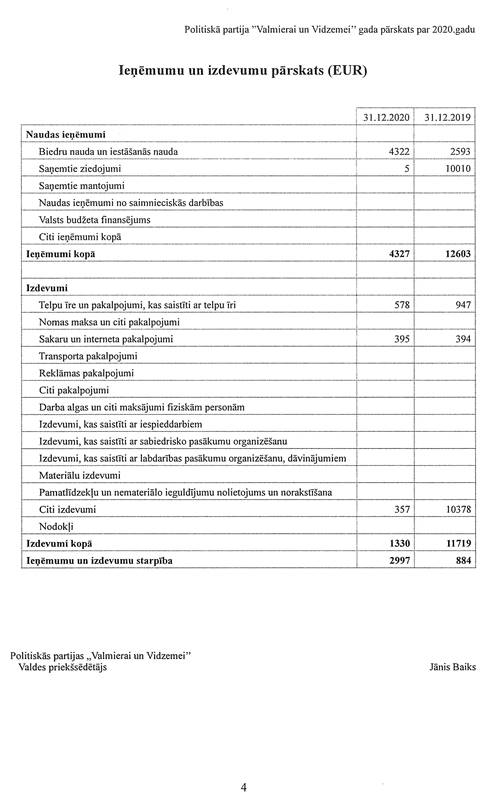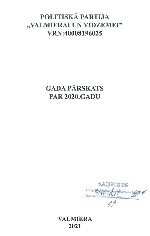 Politiskās partijas "Valmierai un Vidzemei", reģ. Nr. 40008196025, gada pārskats par 2020.gadu