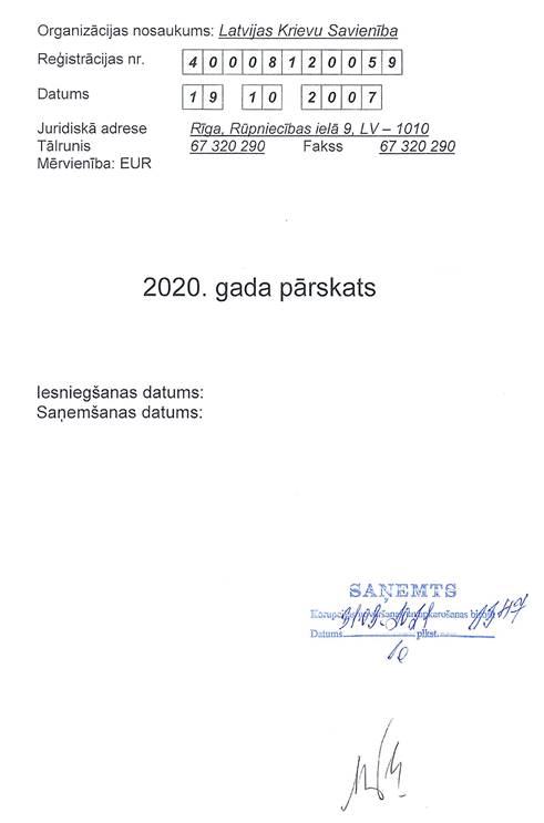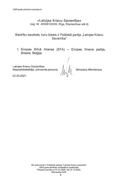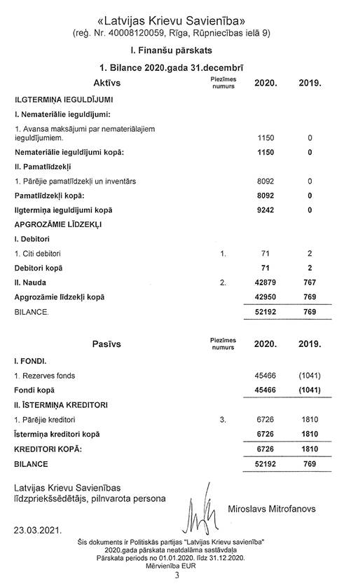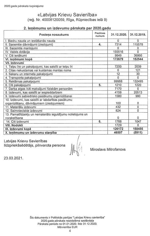 Politiskās partijas "Latvijas Krievu savienība", reģ. Nr. 40008120059, gada pārskats par 2020.gadu
