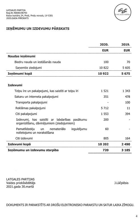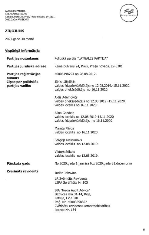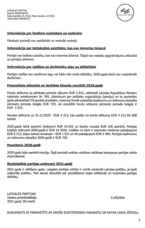 Politiskās partijas "LATGALES PARTIJA", reģ. Nr. 40008198793, gada pārskats par 2020.gadu