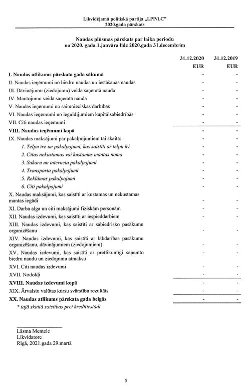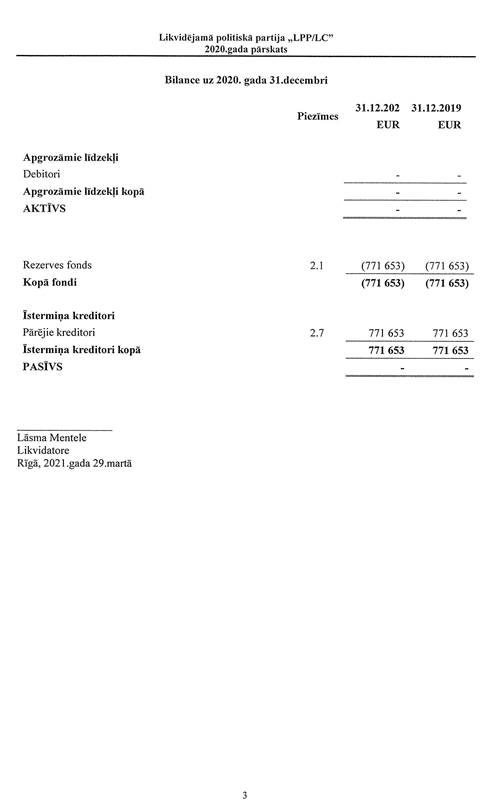 Likvidējamās politiskās partijas "LPP/LC", reģ. Nr. 40008120631, gada pārskats par 2020.gadu