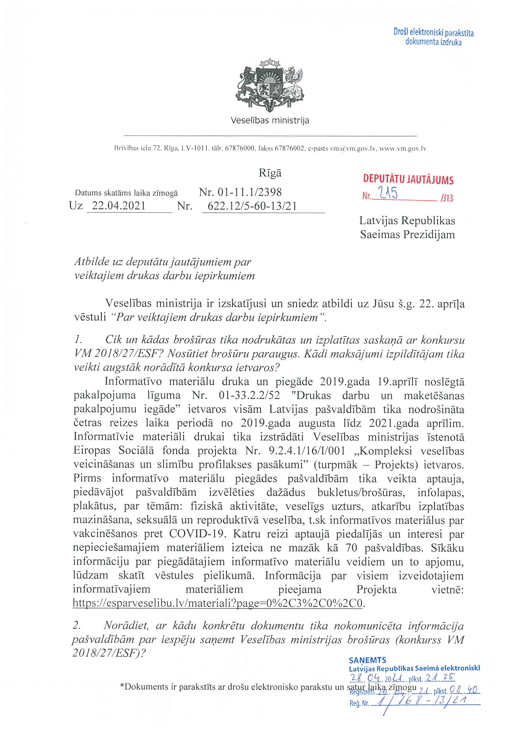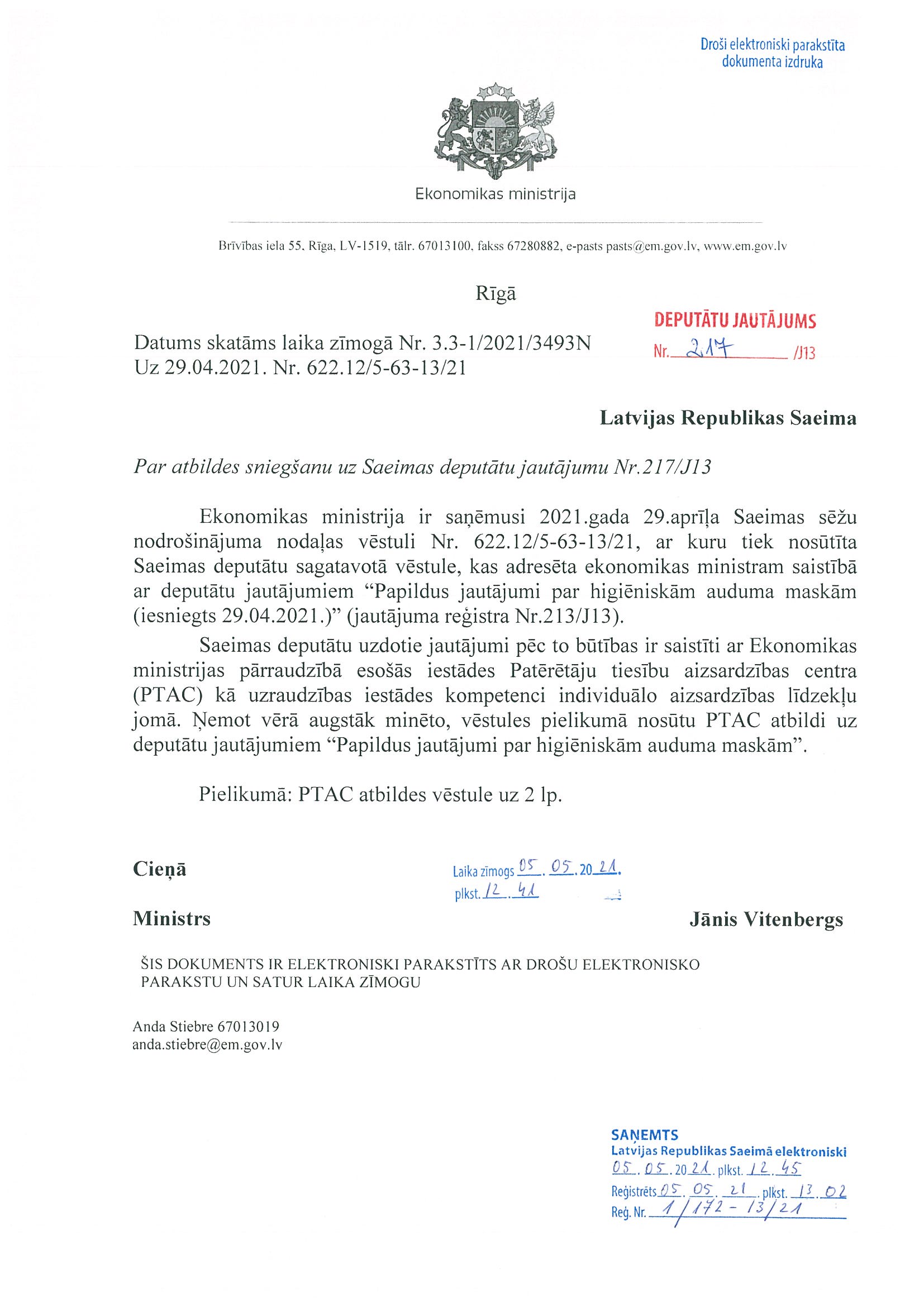 Deputāti Jūlija Stepaņenko, Karina Sprūde, Ļubova Švecova, Edgars Tavars un Viktors Valainis ir iesnieguši jautājumu "Papildus jautājumi par higiēniskām auduma maskām". To nododam ekonomikas ministram atbildes sniegšanai.