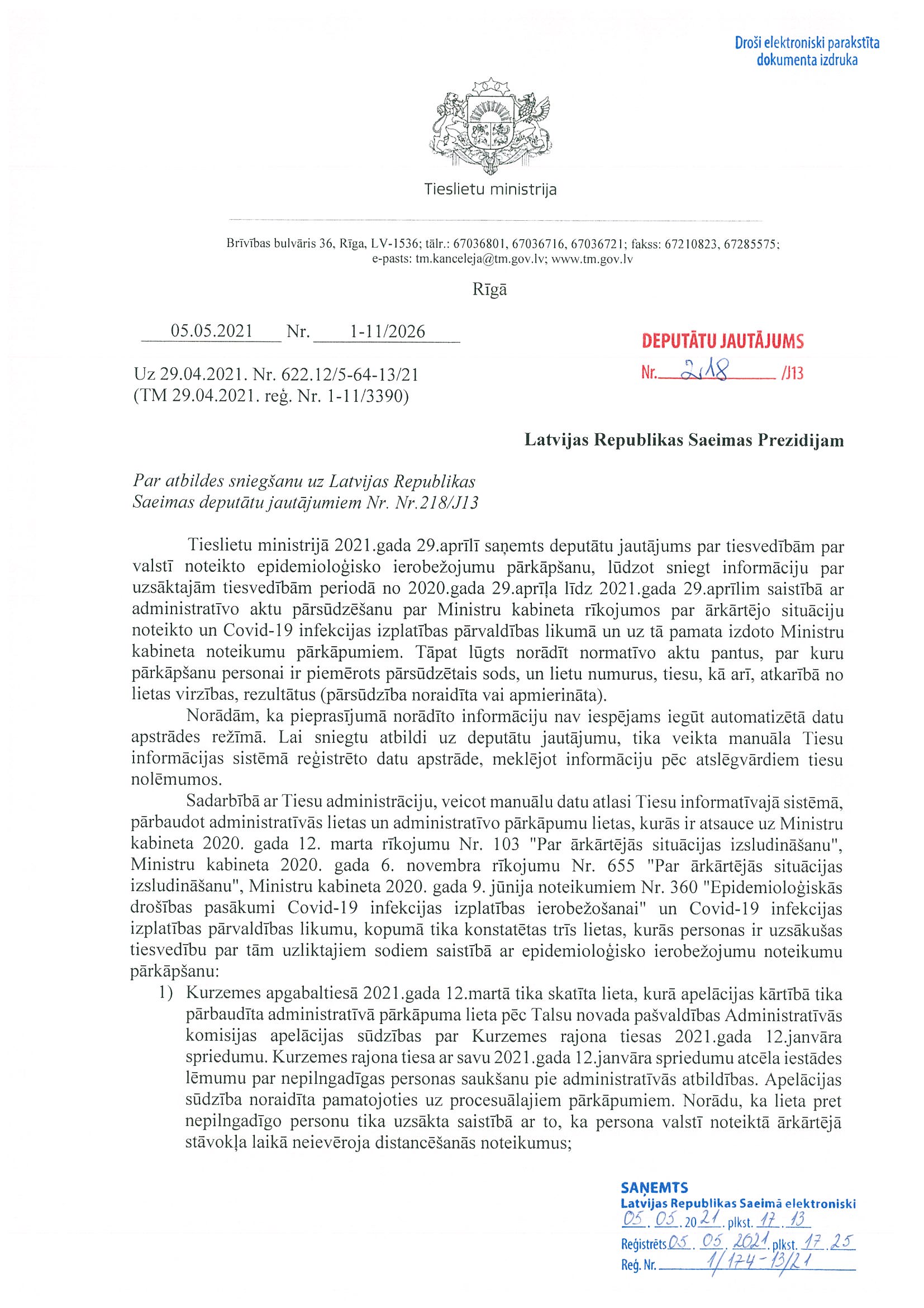 Deputāti Jūlija Stepaņenko, Ļubova Švecova, Edgars Tavars, Karina Sprūde un Viktors Valainis ir iesnieguši jautājumu "Par tiesvedībām par valstī noteikto epidemioloģisko ierobežojumu pārkāpšanu". To nododam tieslietu ministram atbildes sniegšanai.