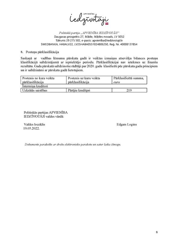 Politiskā partija "Apvienība iedzīvotāji", reģ. Nr. 40008137854, 2021.gada pārskats