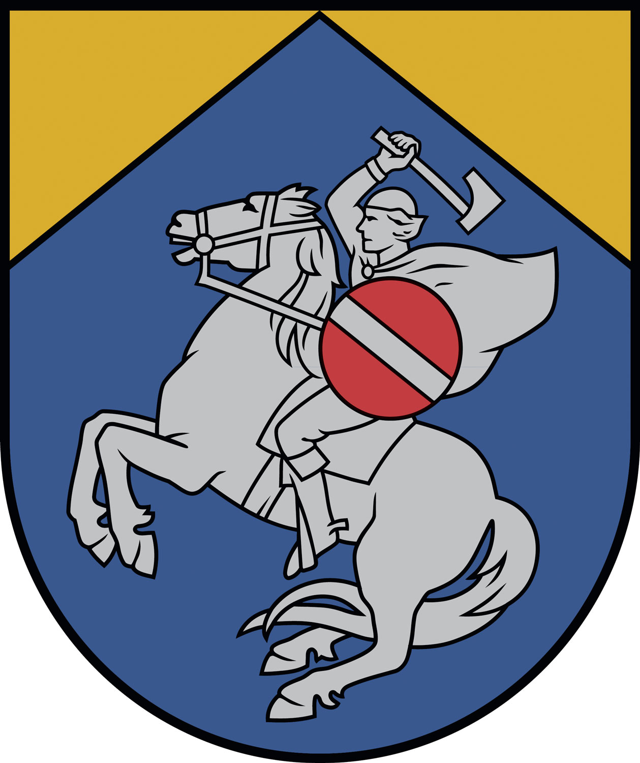 Cēsu novada ģerbonis (Šķelts ar labo un kreiso slīpstūri: zelts un zils. Zilā laukā sudraba senlatviešu kareivis tādā pašā lecošā zirgā ar paceltu kaujas cirvi labajā rokā un apaļu sarkansudrabsarkanu vairogu valsts karoga krāsu samēros kreisajā rokā.) – reģistrēts 2022. gada 4. jūlijā.