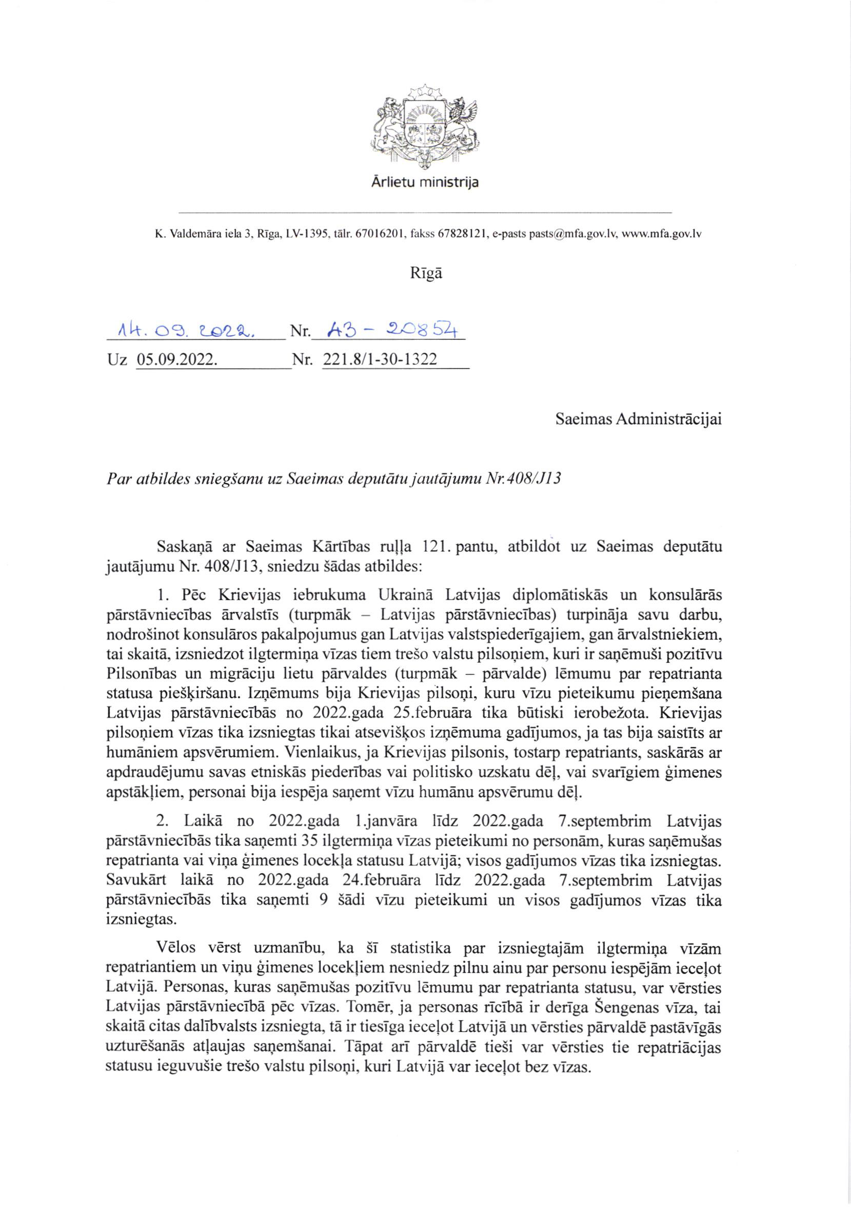 Sēdes vadītāja. Labrīt, godātie kolēģi! Aicinu ieņemt vietas Saeimas Sēžu zālē. Turpināsim izskatīt Latvijas Republikas Saeimas 2022. gada 8. septembra kārtējās sēdes darba kārtību.
