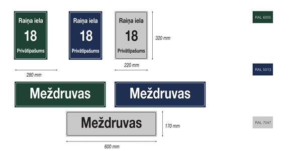 13.1. parametri ēkas numuru plāksnēm: platums 220 mm, augstums 320 mm. Apmale – 5 mm plata, 10 mm attālumā no plāksnes malas. Fonts: Helvetica Narrow;