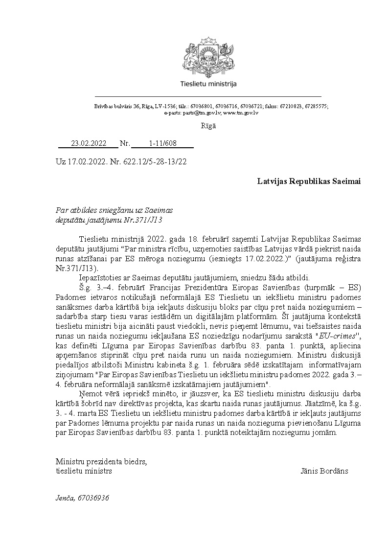 Saeimas paziņojumā ir lielos vilcienos formulēts, kas būtu jādara gan attiecībā pret Krieviju, gan palīdzot Ukrainai. Tālāk tas ir deputātu, valdības un diplomātu uzdevums – precizēt gan sankcijas, gan palīdzību (un mēs ar to jau strādājam) (Skaņas defekts.)... propagandistiem un dažiem oligarhiem, bet arī viņu ģimenes locekļiem un saistītiem iespējotājiem... Liegt viņiem iespēju dzīvoties greznos Rietumeiropas īpašumos, kas pirkti par salaupītu naudu, atslēgt Krieviju no SWIFT, izlēmīgi iedarbināt, nevis maigi piemērot starptautisko organizāciju noteikumus, kas Krievijai ir saistoši.