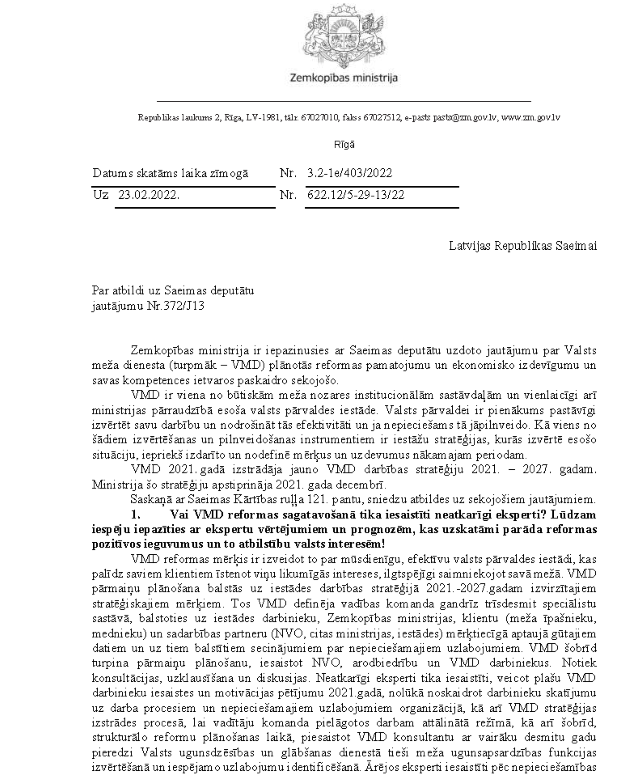 Par deputātu Ulda Auguļa, Jāņa Dūklava, Armanda Krauzes, Edgara Tavara un Viktora Valaiņa jautājumu zemkopības ministram "Par Valsts meža dienesta plānotās reformas pamatojumu un ekonomisko izdevīgumu". Saņemtā rakstveida atbilde iesniedzējus neapmierina, bet mutvārdos deputāti jautājumus uzdot nevēlas.
