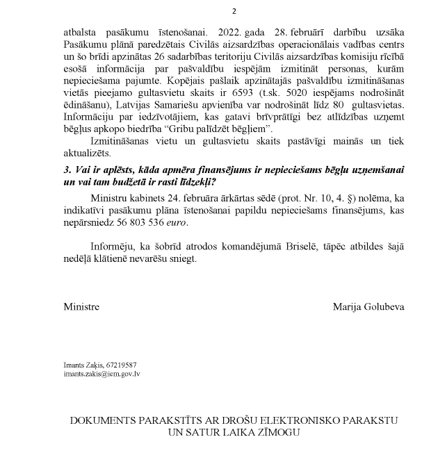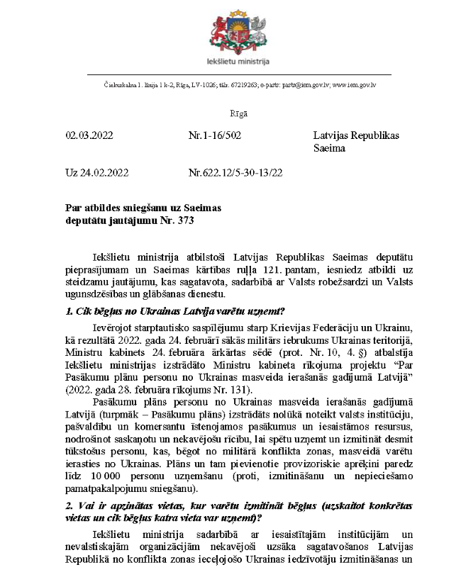 Par deputātu Ramonas Petravičas, Alda Gobzema, Karinas Sprūdes, Māra Možvillo un Ralfa Nemiro steidzamo jautājumu iekšlietu ministrei Marijai Golubevai "Par bēgļu uzņemšanu no Ukrainas" un par deputātu Ramonas Petravičas, Māra Možvillo, Ralfa Nemiro, Karinas Sprūdes un Alda Gobzema steidzamo jautājumu Ministru prezidentam Arturam Krišjānim Kariņam un iekšlietu ministrei Marijai Golubevai "Par valsts iekšējo drošību un provokāciju novēršanu". Saņemtās rakstveida atbildes iesniedzējus neapmierina. Iekšlietu ministre informē, ka nevar ierasties uz mutvārdu atbildes sniegšanu, jo atrodas komandējumā.