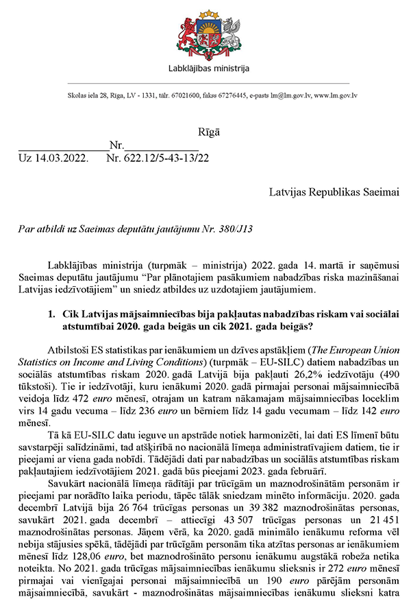 Un uz deputātu Ramonas Petravičas, Māra Možvillo, Karinas Sprūdes, Ralfa Nemiro un Alda Gobzema jautājumu labklājības ministram Gatim Eglītim "Par plānotajiem pasākumiem nabadzības riska mazināšanai Latvijas iedzīvotājiem" saņemtā rakstveida atbilde iesniedzējus neapmierina, bet mutvārdos papildjautājumus uzdot viņi nevēlas.