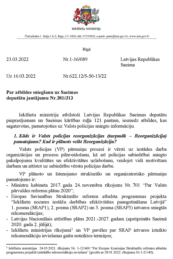 Sēdes vadītāja. Cienījamās deputātes! Godātie deputāti! Atsākam darbu pie Latvijas Republikas Saeimas 2022. gada 17. marta kārtējās sēdes darba kārtības izskatīšanas.