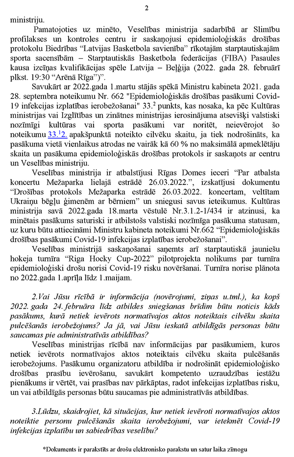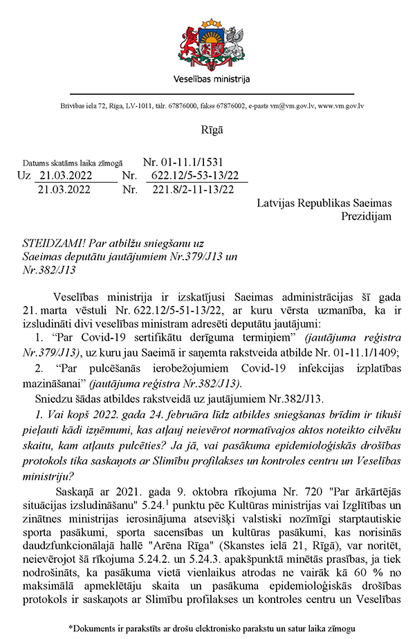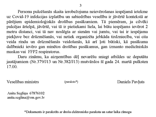 Uz deputātu Ramonas Petravičas, Māra Možvillo, Ievas Krapānes, Ralfa Nemiro, Kaspara Ģirģena un Alda Gobzema jautājumu veselības ministram Danielam Pavļutam "Par Covid-19 sertifikātu derīguma termiņiem" saņemtā rakstveida atbilde iesniedzējus neapmierina. Ministrs informē, ka saistībā ar aizņemtību nevar ierasties un sniegt mutvārdu atbildi.