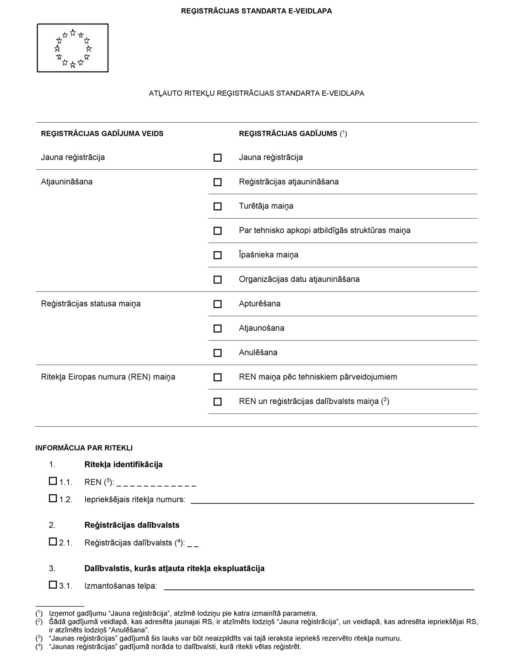12. Vienu pieteikumu jauna ritekļa reģistrācijai var aizpildīt un iesniegt par vairākām ritekļa vienībām, ja pieteikumā visi ieraksti attiecas uz katru ritekļa vienību, papildus pievienojot attiecīgo ritekļa vienību sarakstu, kurā ir norādīti to numuri.