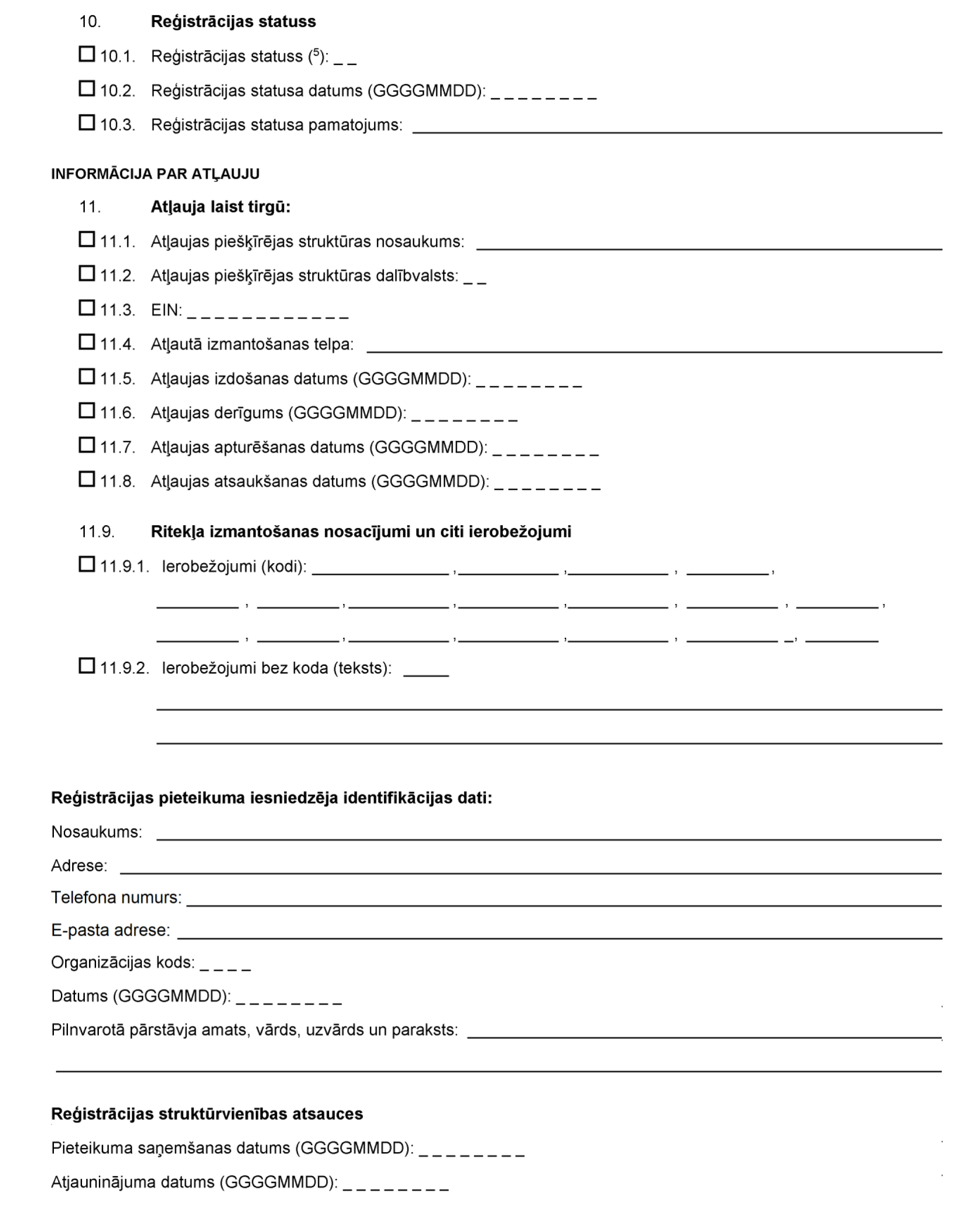 | 12 | Apturēta | Precizē īpašnieks vai turētājs un norāda pieteikuma veidlapas10.3. parametrā | Ritekļa