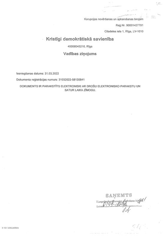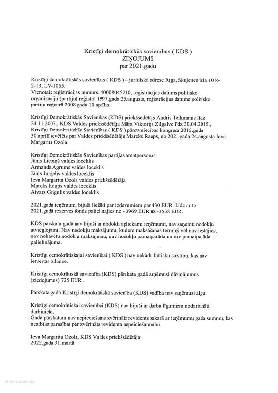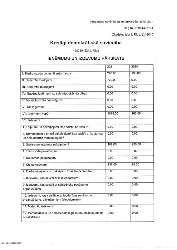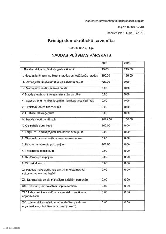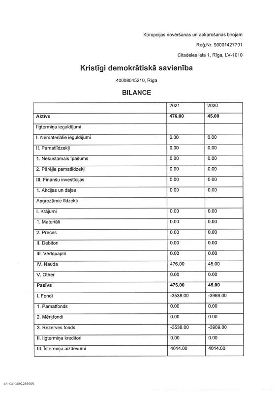 Politiskās partijas "Kristīgi demokrātiskā savienība", reģ. Nr. 40008045210, 2021.gada pārskats, EUR