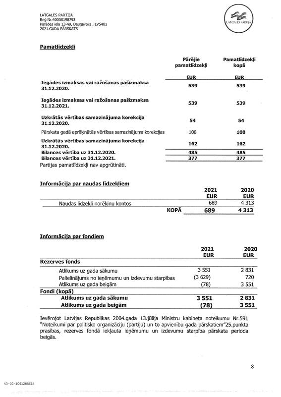 Politiskās partijas "Latgales partija", reģ. Nr. 40008198793, 2021.gada pārskats