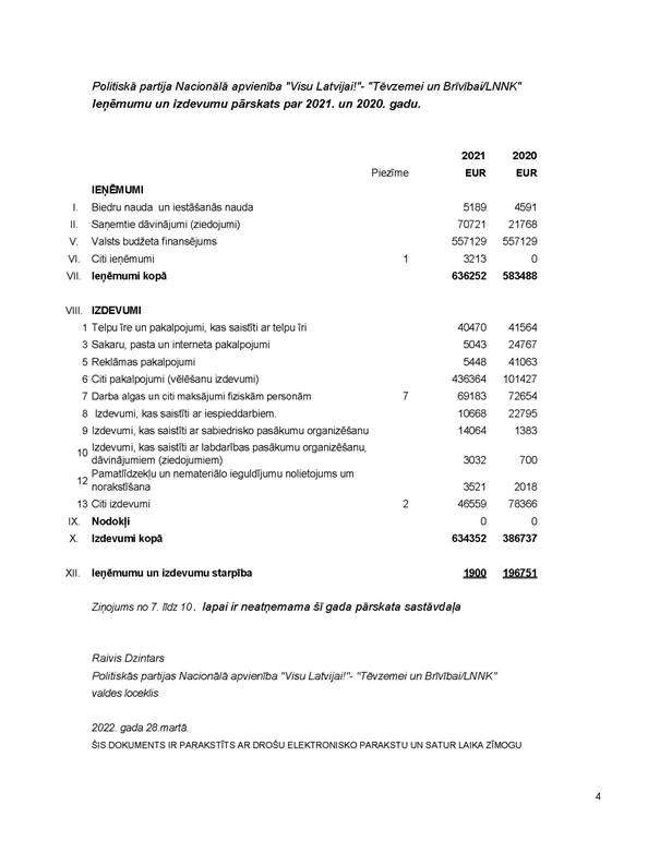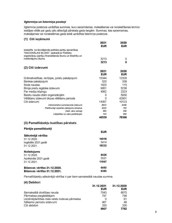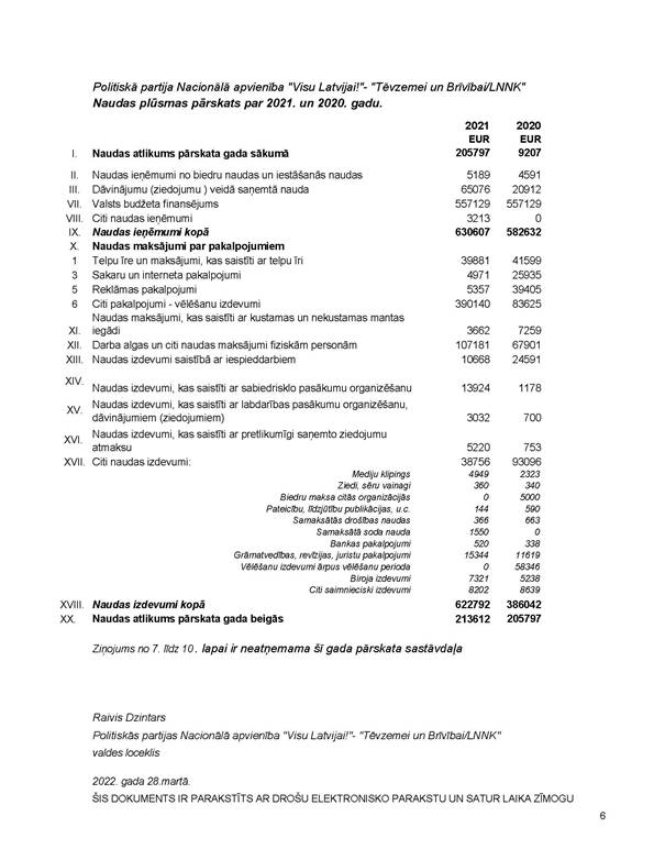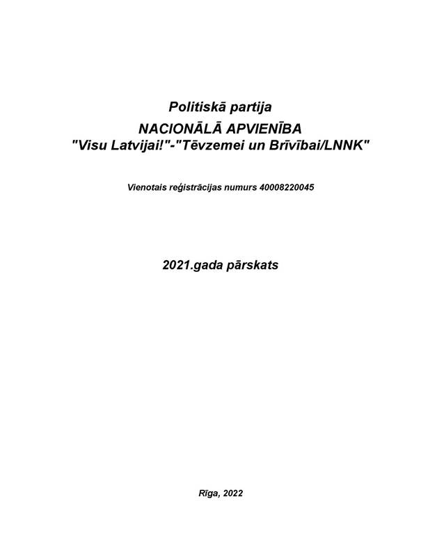 Politiskās partijas "Nacionālā apvienība "Visu Latvijai!"-"Tēvzemei un Brīvībai/LNNK"", reģ. 40008220045, 2021. gada pārskats, EUR