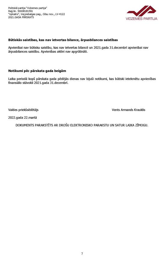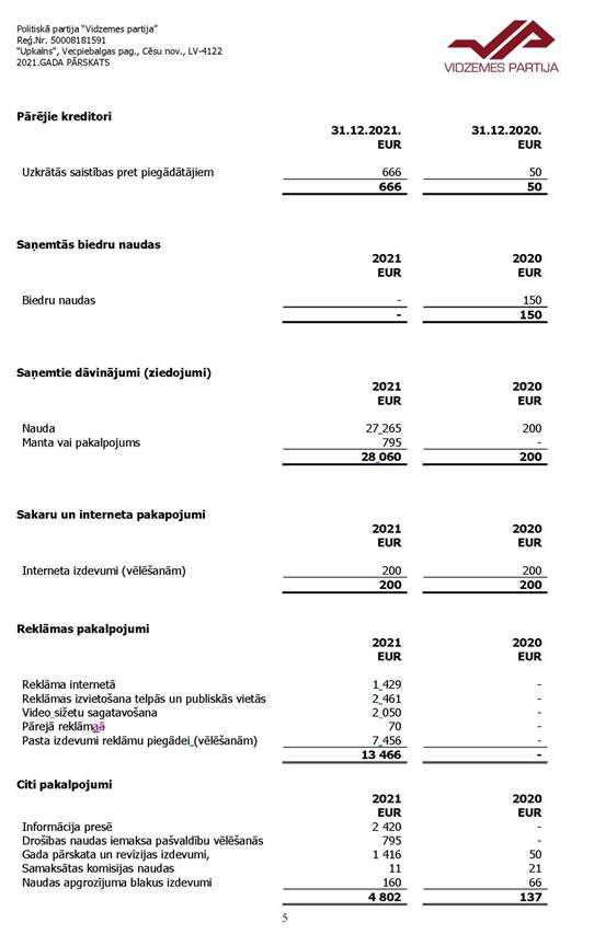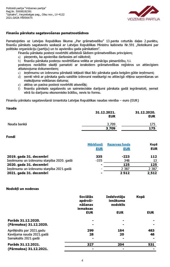 Politiskās partijas "VIDZEMES PARTIJA", reģ. Nr. 50008181591, 2021. gada pārskats, EUR