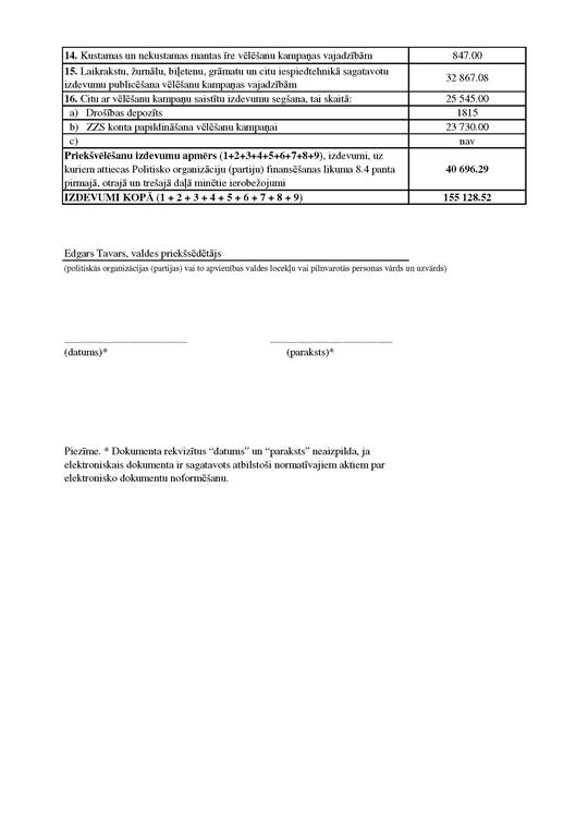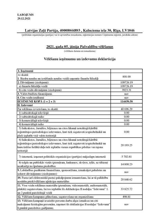 Politiskās partijas "Latvijas Zaļā partija", reģ. Nr. 40008044893, precizēta 2021.gada 5.jūnija vēlēšanu ieņēmumu un izdevumu deklarācija
