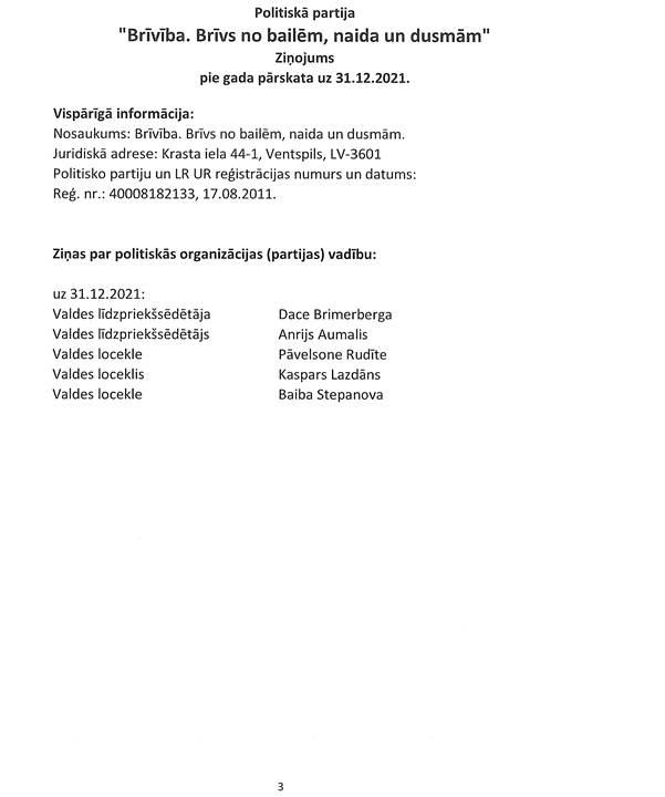 Politiskā partija "Brīvība. Brīvs no bailēm, naida un dusmām", reģ. Nr. 40008182133, 2021.gada pārskats