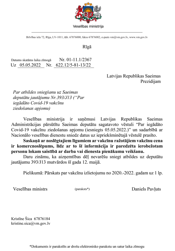 Par deputātu Sprūdes, Stepaņenko, Gobzema, Petravičas un Možvillo jautājumu veselības ministram "Par iegādāto Covid-19 vakcīnu ziedošanas apjomu". Saņemtā rakstveida atbilde iesniedzējus neapmierina. Ministrs informē, ka aizņemtības dēļ nevar ierasties un sniegt mutvārdu atbildi.