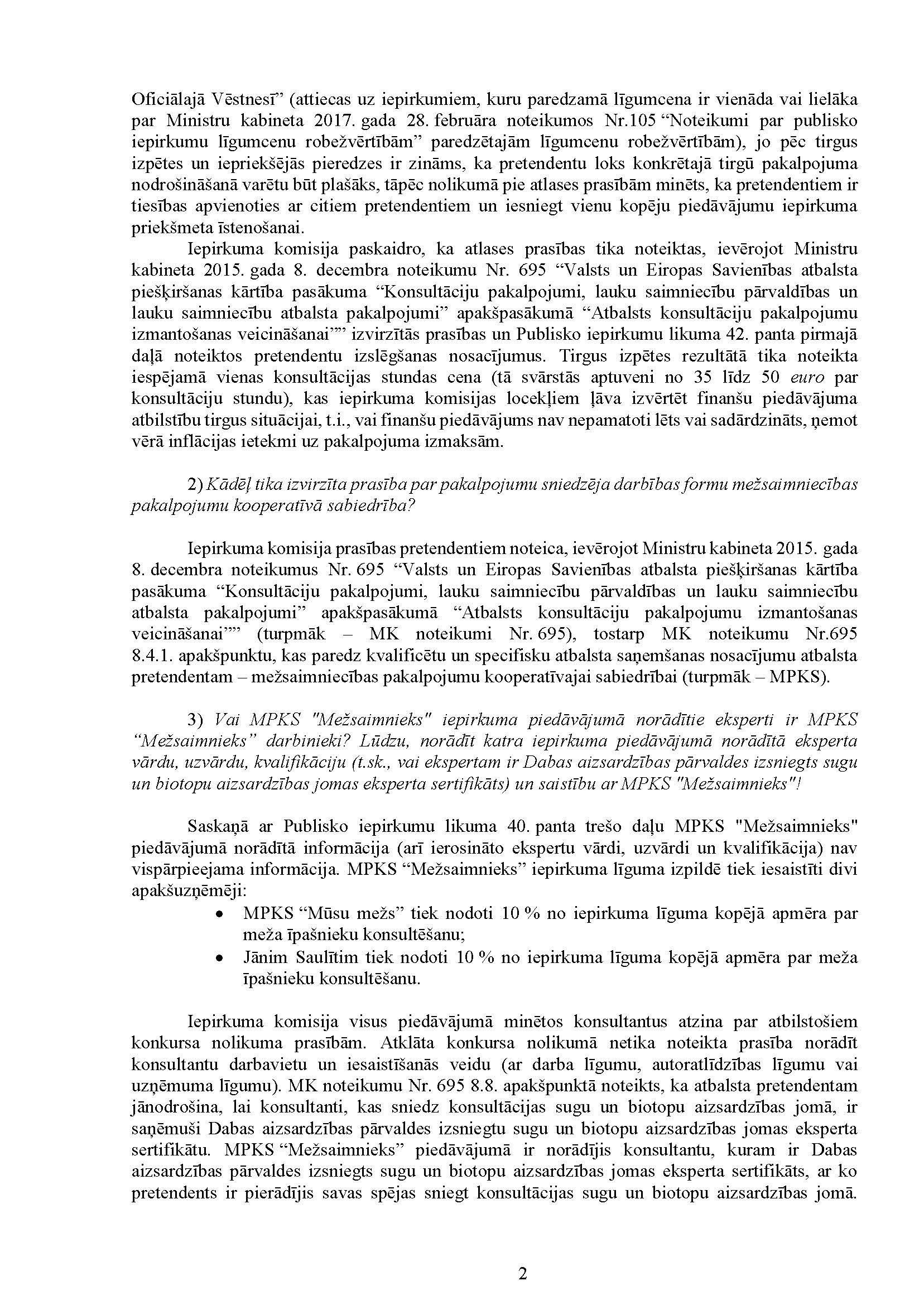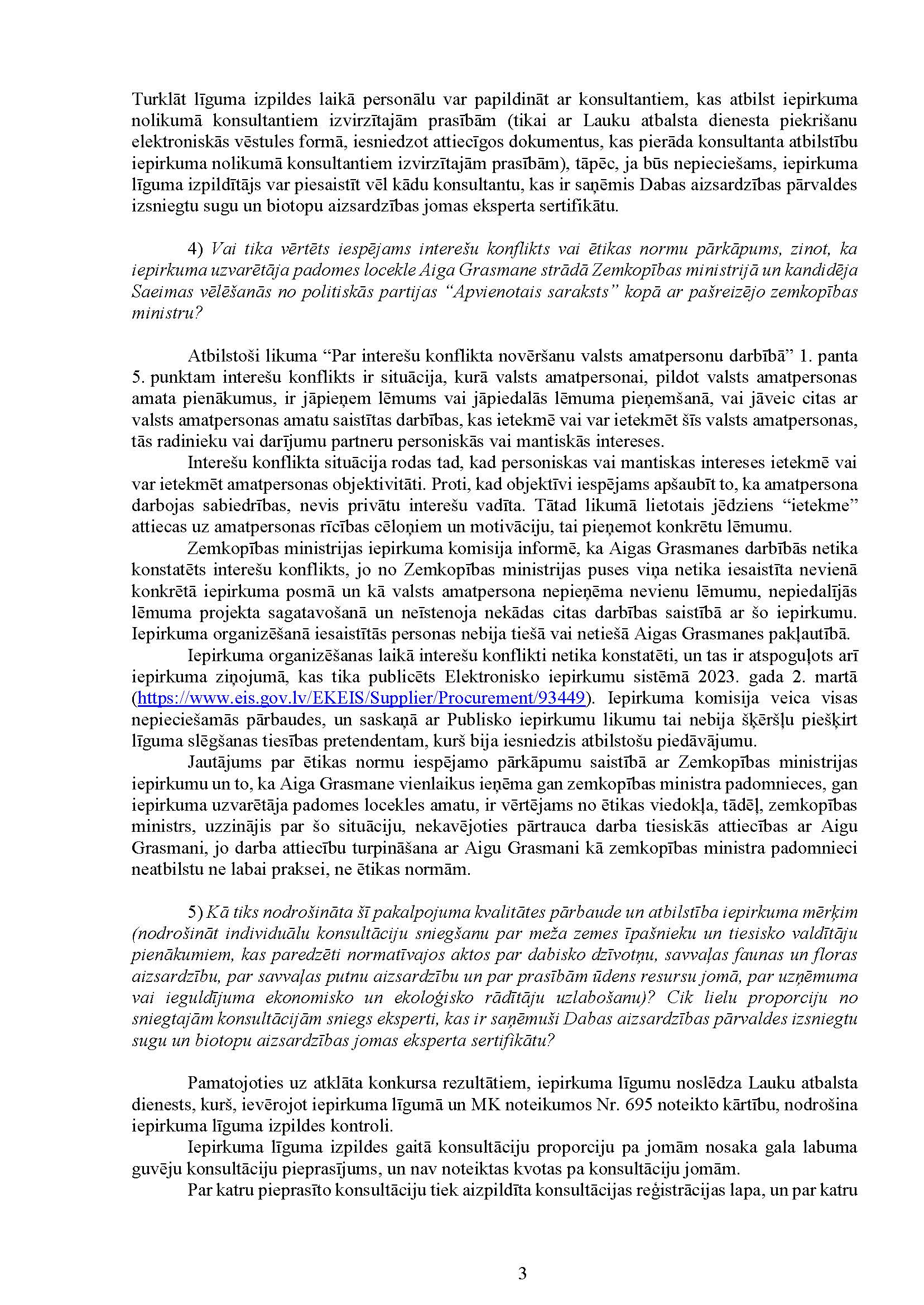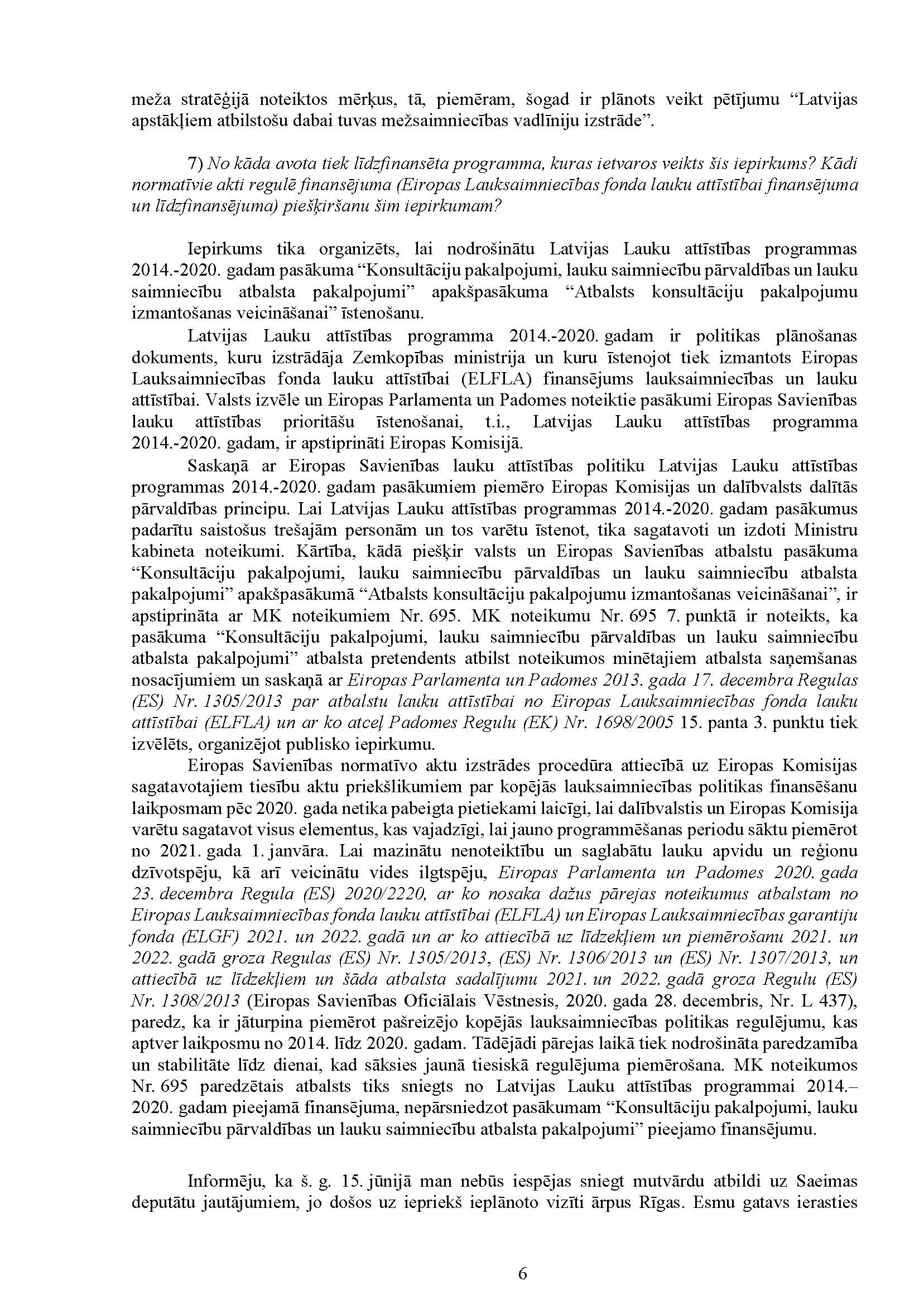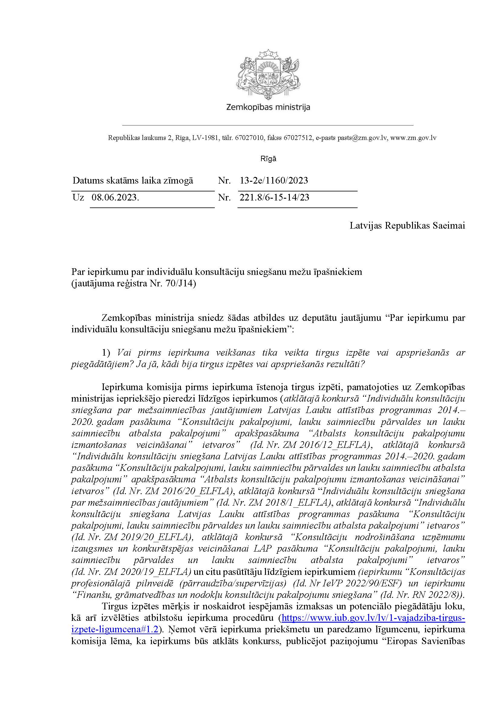 Deputāti Jana Simanovska, Atis Švinka, Kaspars Briškens, Skaidrīte Ābrama un Andris Šuvajevs ir uzdevuši jautājumu zemkopības ministram Didzim Šmitam "Par iepirkumu par individuālu konsultāciju sniegšanu mežu īpašniekiem". Saņemtā rakstveida atbilde iesniedzējus neapmierina, bet mutvārdos papildu jautājumus uzdot nevēlas.