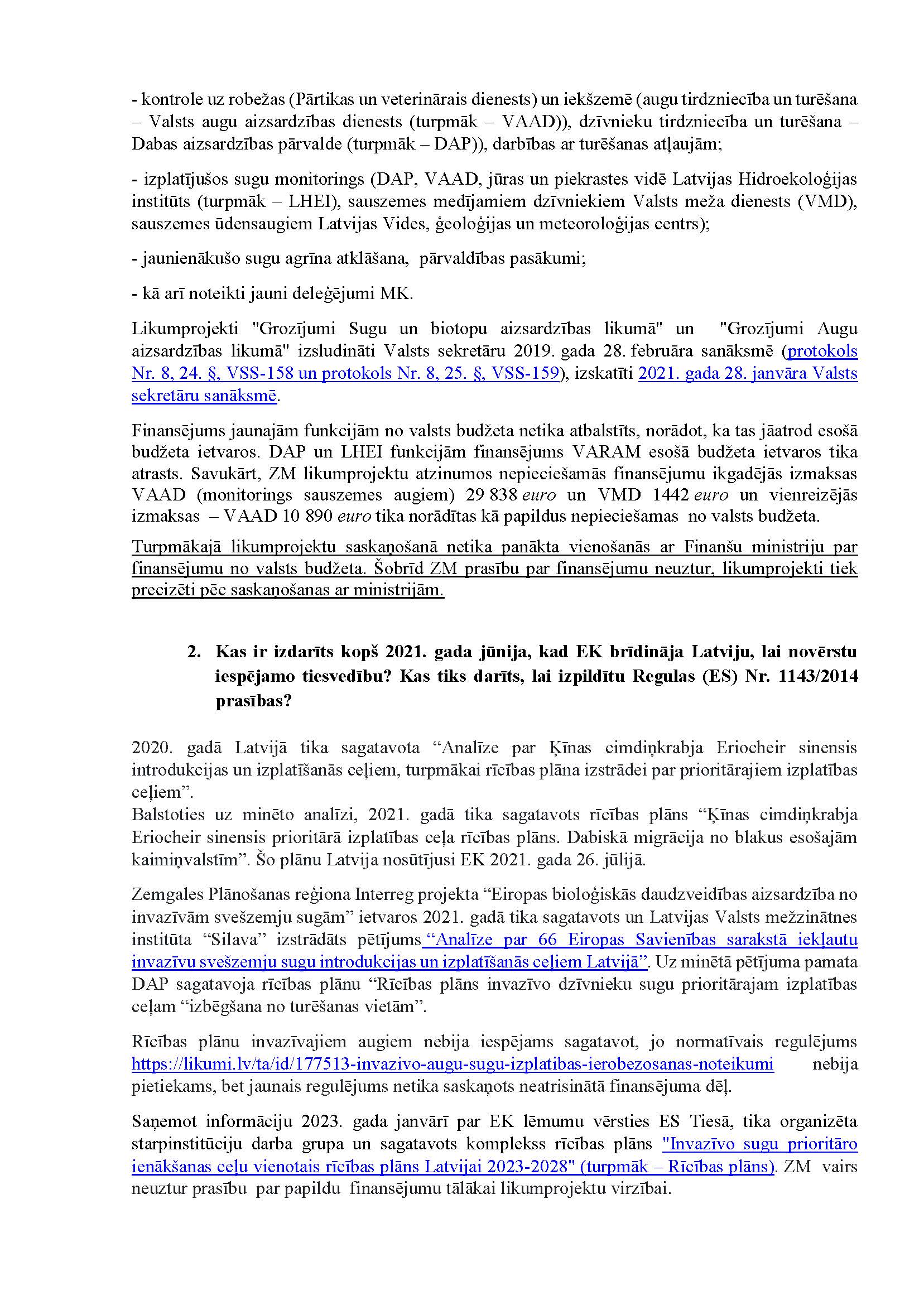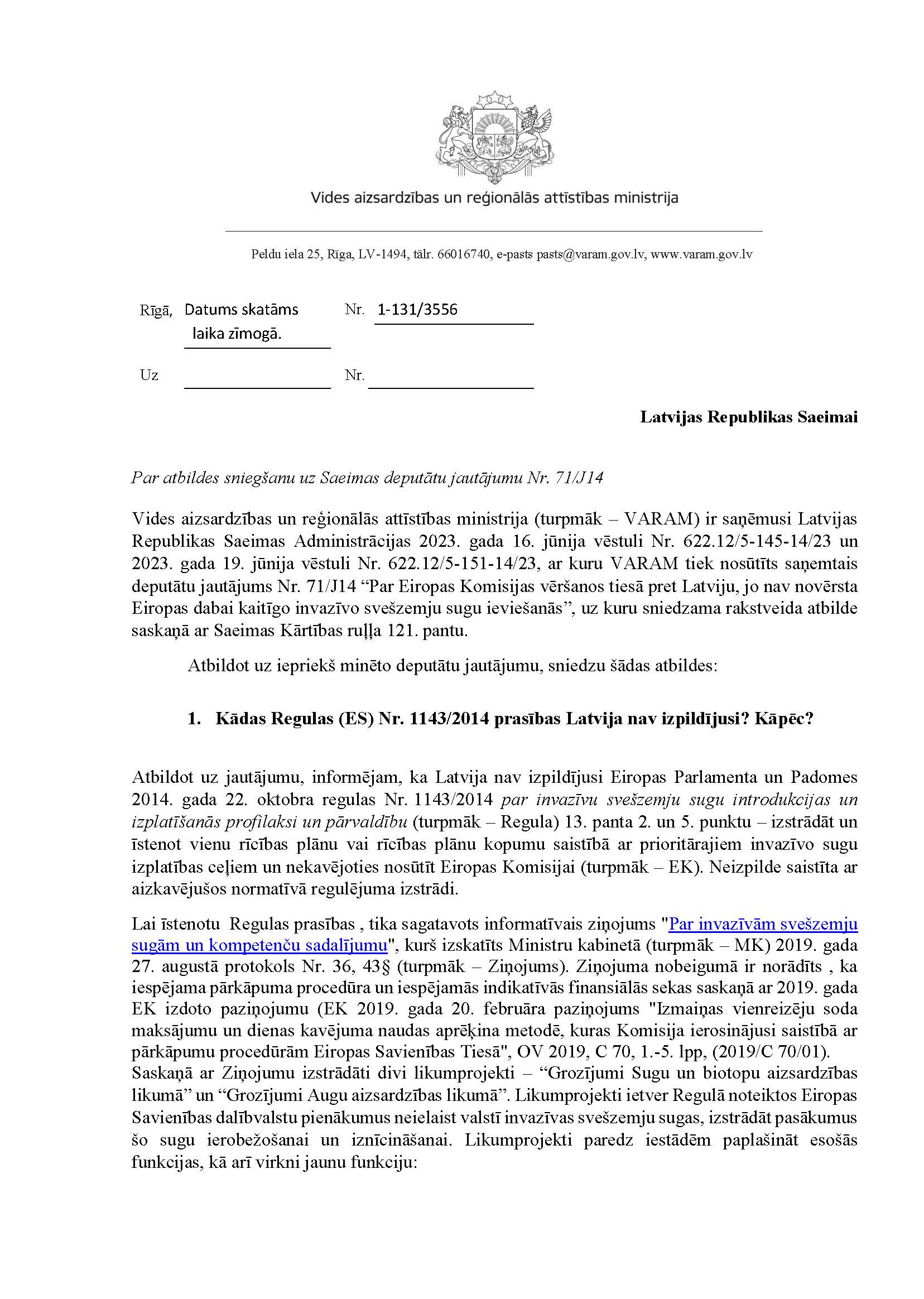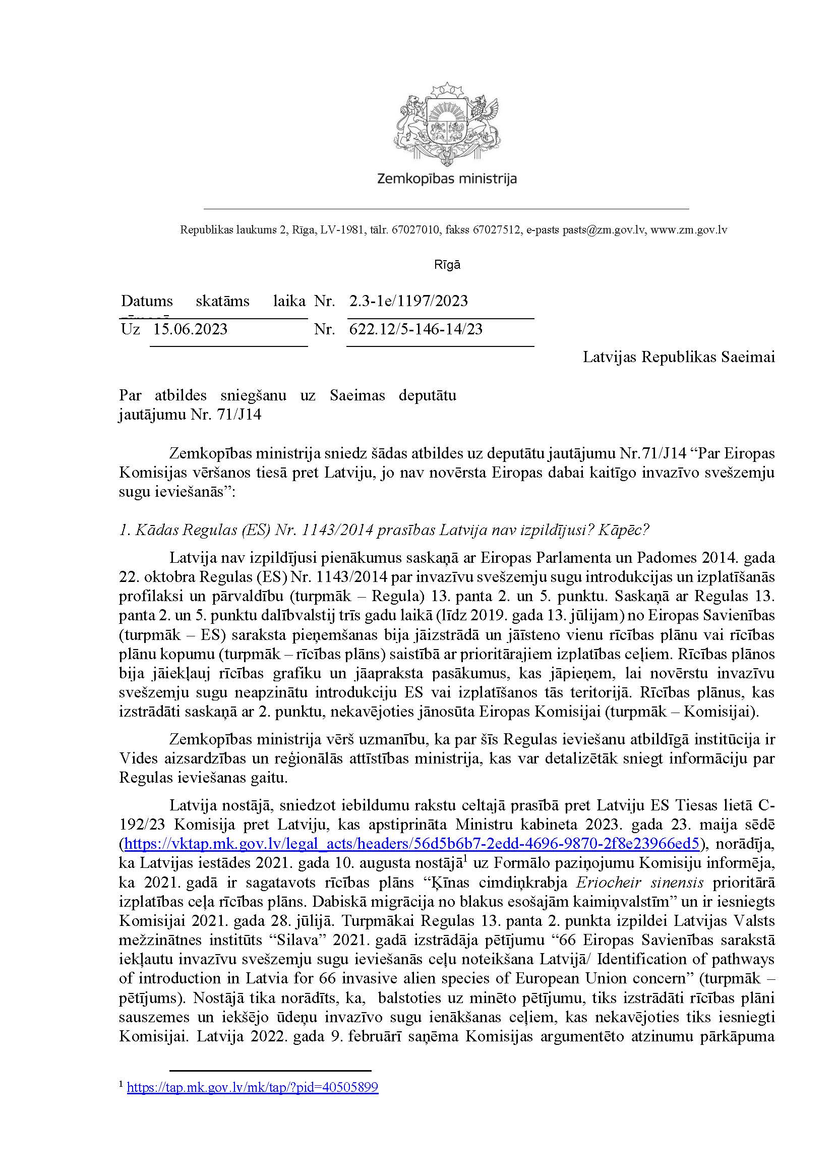 Deputāti Jana Simanovska, Edmunds Cepurītis, Edgars Zelderis, Leila Rasima un Antoņina Ņenaševa ir uzdevuši jautājumu vides aizsardzības un reģionālās attīstības ministram Mārim Sprindžukam un zemkopības ministram Didzim Šmitam "Par Eiropas Komisijas vēršanos tiesā pret Latviju, jo nav novērsta Eiropas dabai kaitīgo invazīvo svešzemju sugu ieviešanās". Saņemtā rakstveida atbilde iesniedzējus neapmierina, bet mutvārdos papildu jautājumus uzdot nevēlas.
