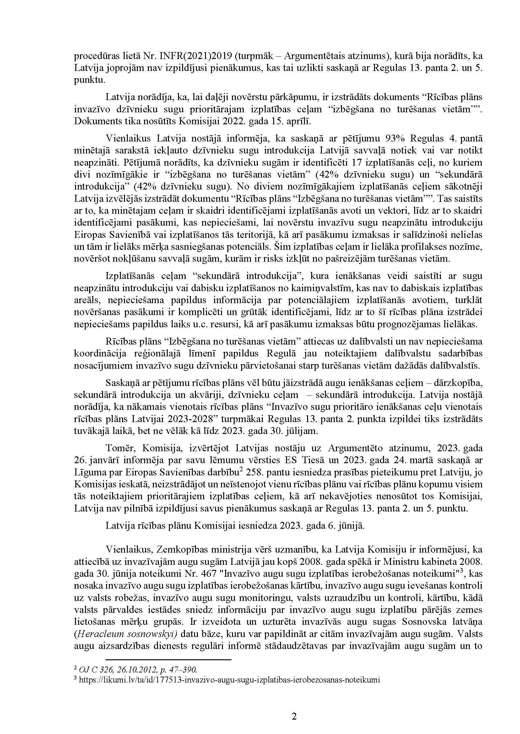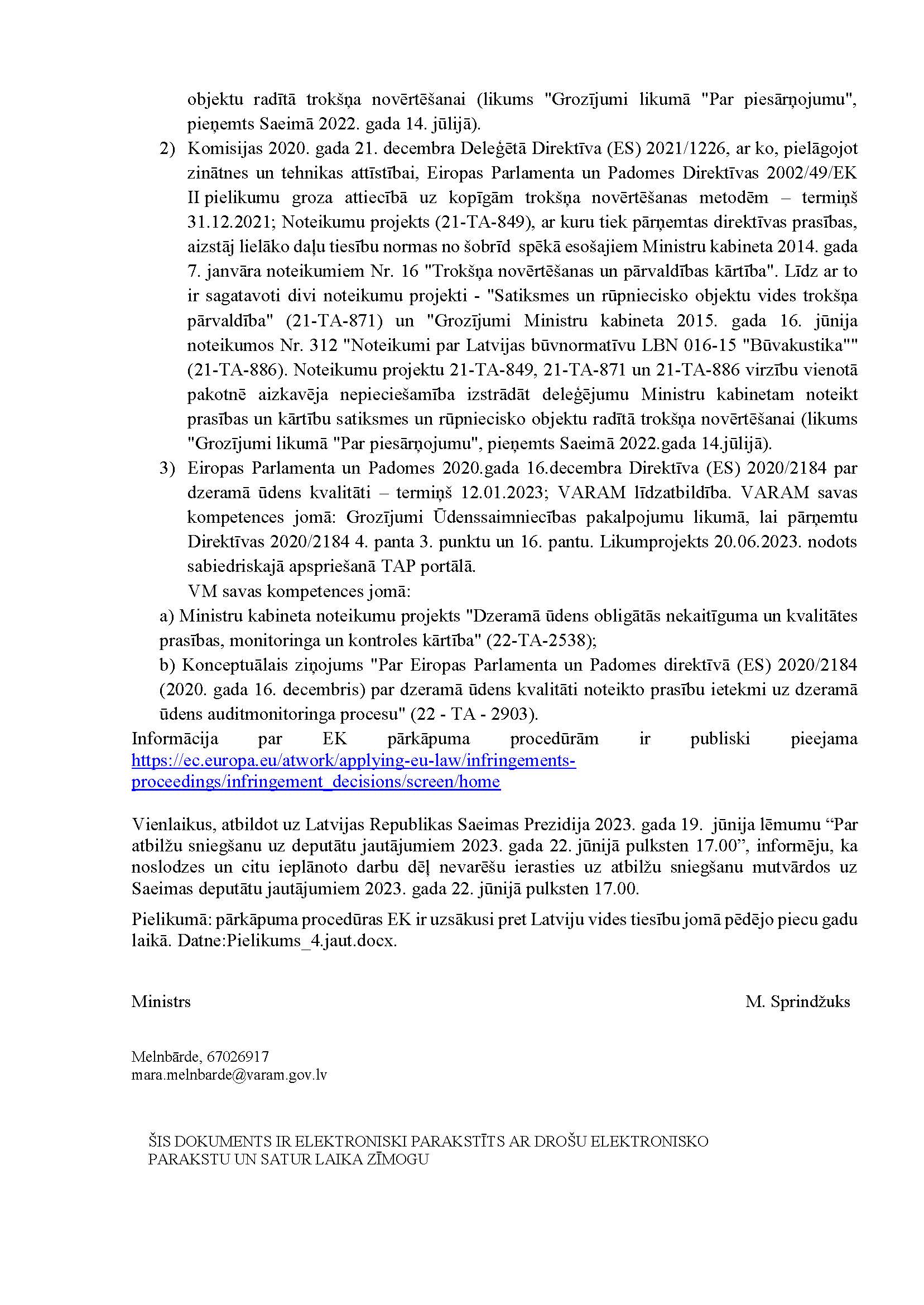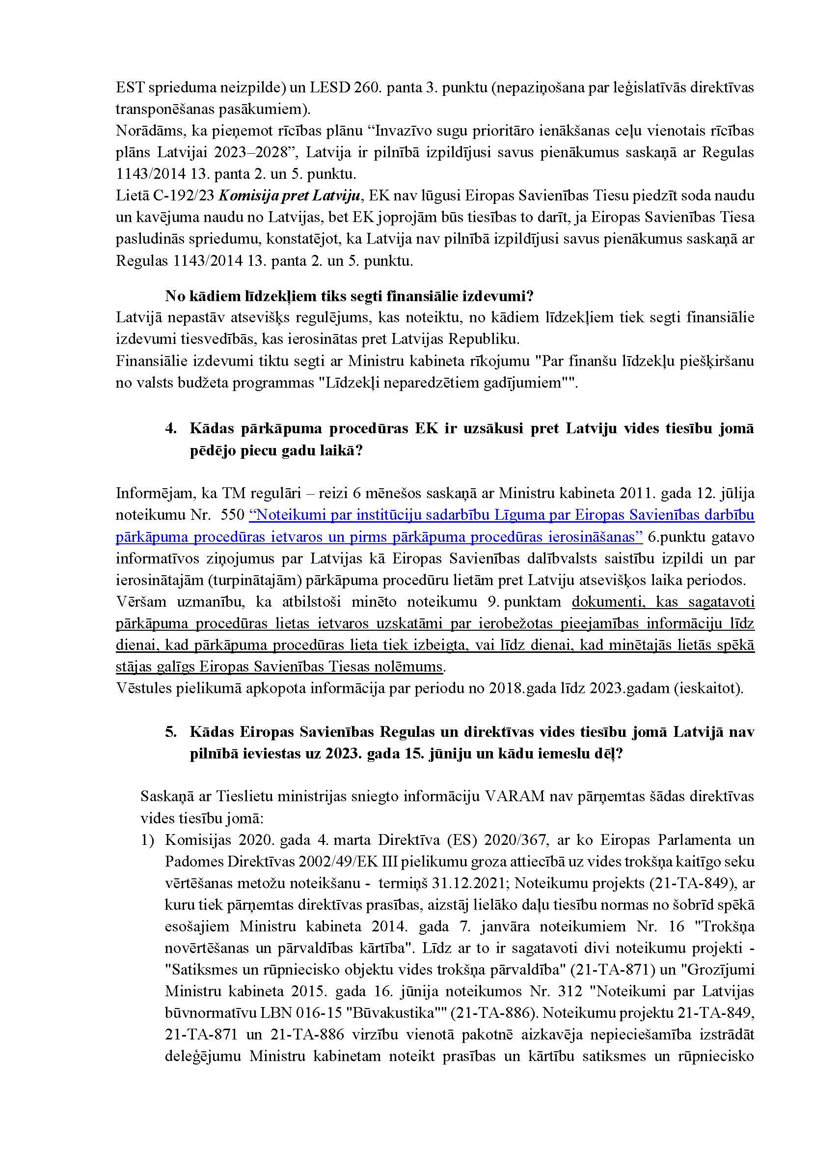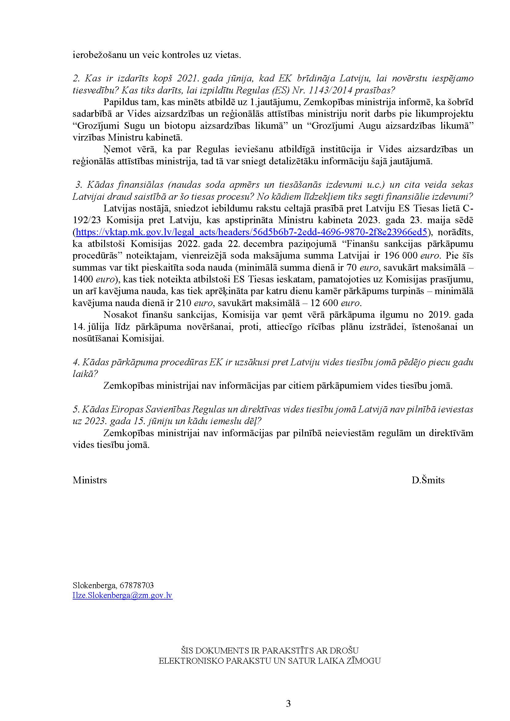 Deputāti Jana Simanovska, Edmunds Cepurītis, Edgars Zelderis, Leila Rasima un Antoņina Ņenaševa ir uzdevuši jautājumu vides aizsardzības un reģionālās attīstības ministram Mārim Sprindžukam un zemkopības ministram Didzim Šmitam "Par Eiropas Komisijas vēršanos tiesā pret Latviju, jo nav novērsta Eiropas dabai kaitīgo invazīvo svešzemju sugu ieviešanās". Saņemtā rakstveida atbilde iesniedzējus neapmierina, bet mutvārdos papildu jautājumus uzdot nevēlas.