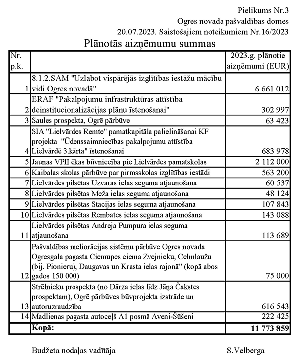 "3. Noteikt 2023. gada budžetā 11 773 859 euro (vienpadsmit miljoni septiņi simti septiņdesmit trīs tūkstoši astoņi simti piecdesmit deviņi euro) lielu Valsts kases kredītu Ogres novada pašvaldības projektu nodrošināšanai saskaņā ar Pielikums Nr. 3."