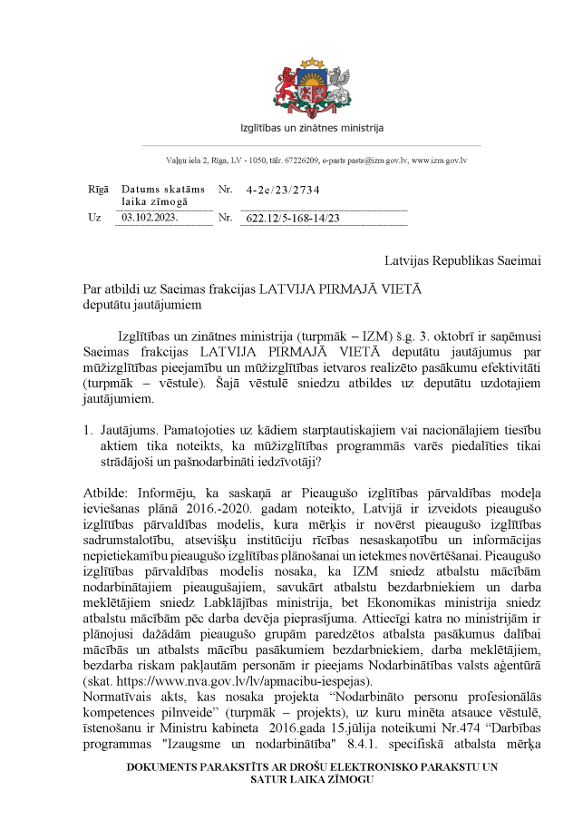 Deputātu Aināra Šlesera, Ramonas Petravičas, Kristapa Krištopana, Viļa Krištopana un Ričarda Šlesera jautājums izglītības un zinātnes ministrei Andai Čakšai "Par mūžizglītības pieejamību un mūžizglītības ietvaros realizēto pasākumu efektivitāti". Saņemtā rakstveida atbilde iesniedzējus neapmierina, bet mutvārdos papildjautājumus uzdot viņi nevēlas.