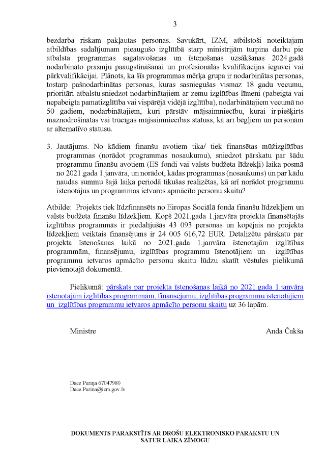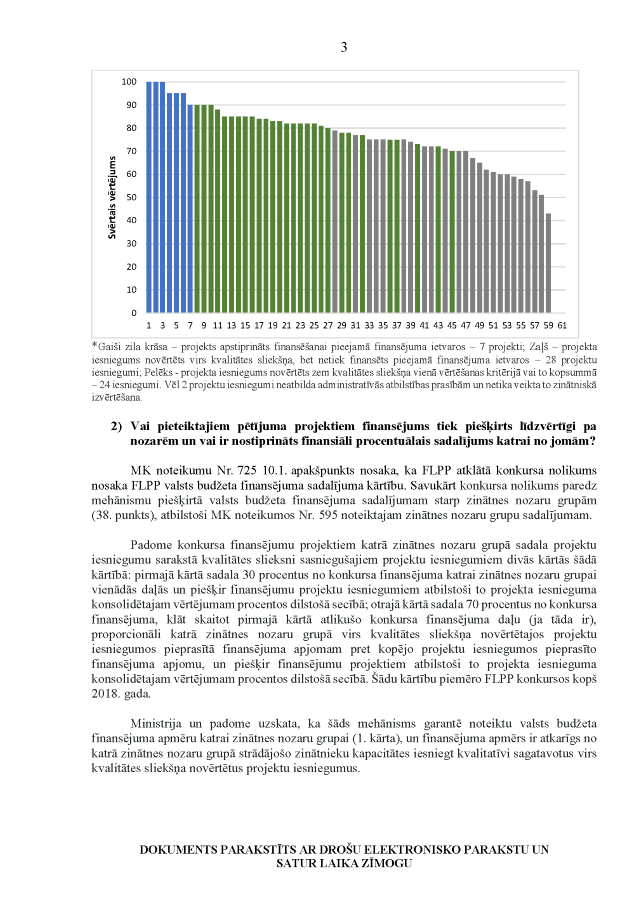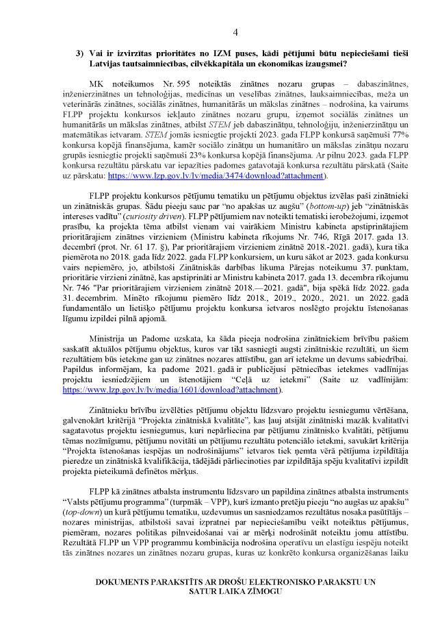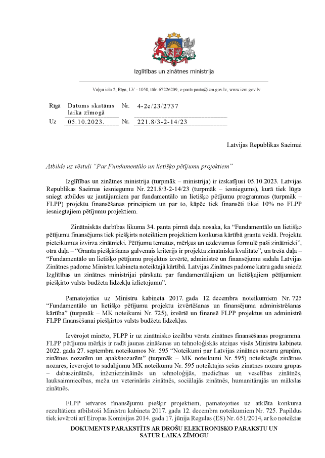Deputātu Česlava Batņas, Lindas Matisones, Edgara Putras, Aivas Vīksnas, Didža Šmita, Māra Kučinska un Edgara Tavara jautājums izglītības un zinātnes ministrei Andai Čakšai "Par fundamentālo un lietišķo pētījumu projektiem". Saņemtā rakstveida atbilde iesniedzējus neapmierina, bet mutvārdos papildjautājumus viņi uzdot nevēlas.