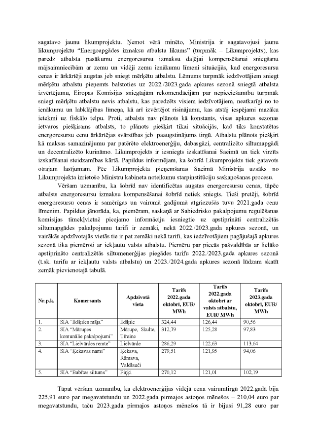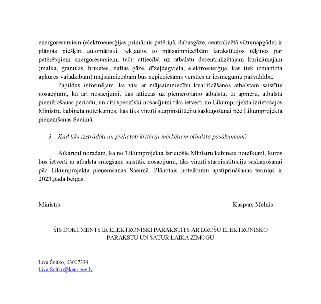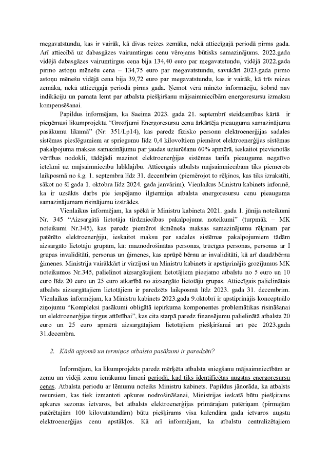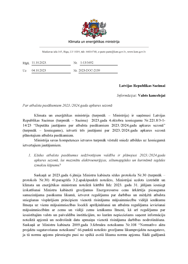 Deputātu Edgara Tavara, Česlava Batņas, Jura Viļuma, Edvarda Smiltēna un Māra Kučinska jautājums Ministru prezidentei Evikai Siliņai "Par atbalsta pasākumiem 2023./2024. gada apkures sezonā". Jautājums pāradresēts klimata un enerģētikas ministram Kasparam Melnim. Saņemtā rakstveida atbilde iesniedzējus neapmierina, bet mutvārdos papildjautājumus viņi uzdot nevēlas.