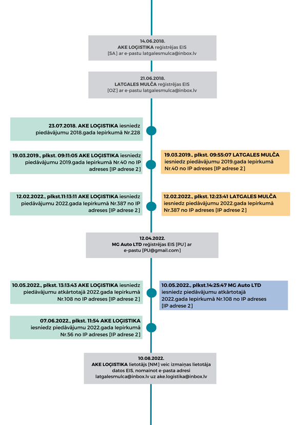 19 KP veica LVM 2018. gada Iepirkumā Nr. 228, 2019. gada Iepirkumā Nr. 40, 2022. gada Iepirkumā Nr. 387, atkārtotā 2022. gada Iepirkumā Nr. 108 un 2022. gada Iepirkumā Nr. 56 iesniegto piedāvājumu padziļinātu izpēti, iegūstot informāciju un pretendentu piedāvājumus no EIS. Šī Lēmuma 27. rindkopā iekļautajā Tabulā Nr. 1 apkopota informācija par visiem iepirkumiem, kur AKE LOĢISTIKA, LATGALES MULČA un MG Auto LTD piedalījušies (Iepirkuma nosaukums, piedāvājuma iesniegšanas termiņš, konkrētā uzņēmuma vai uzņēmumu piedāvājumu iesniegšanas laiks, IP adrese, no kuras piedāvājums iesniegts, statuss pēc piedāvājuma iesniegšanas).