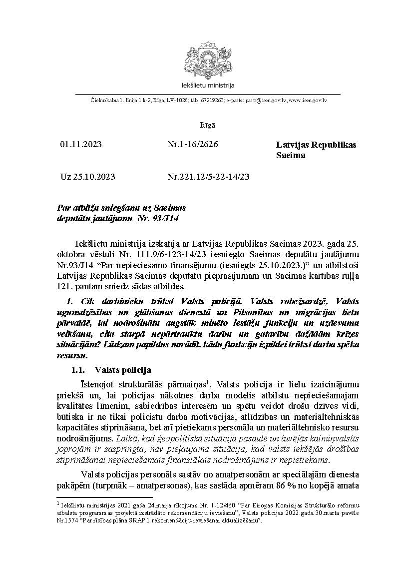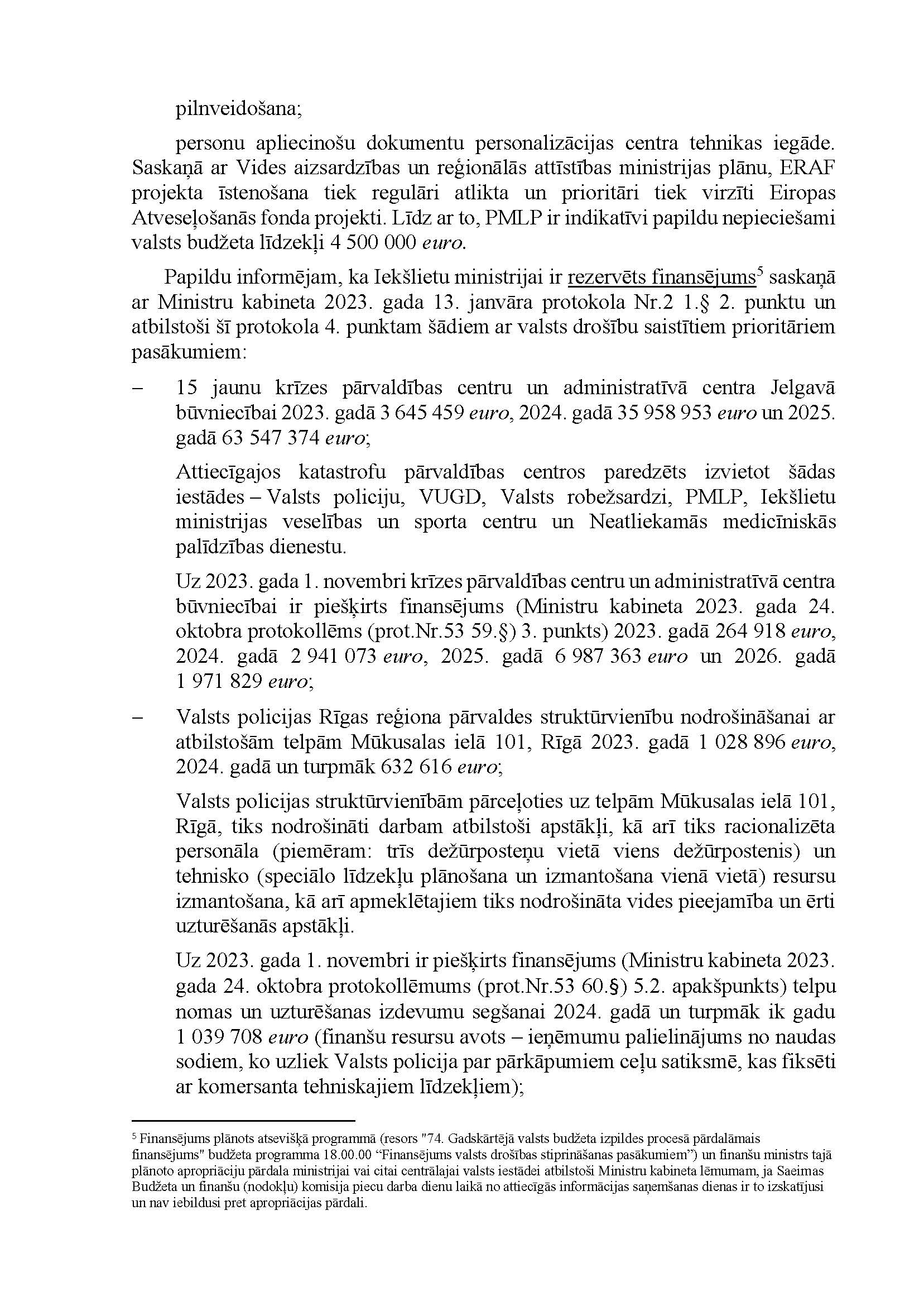 Deputātu Ramonas Petravičas, Aināra Šlesera, Kristapa Krištopana, Edmunda Zivtiņa un Ričarda Šlesera jautājums iekšlietu ministram Rihardam Kozlovskim "Par nepieciešamo finansējumu". Saņemtā rakstveida atbilde iesniedzējus apmierina.
