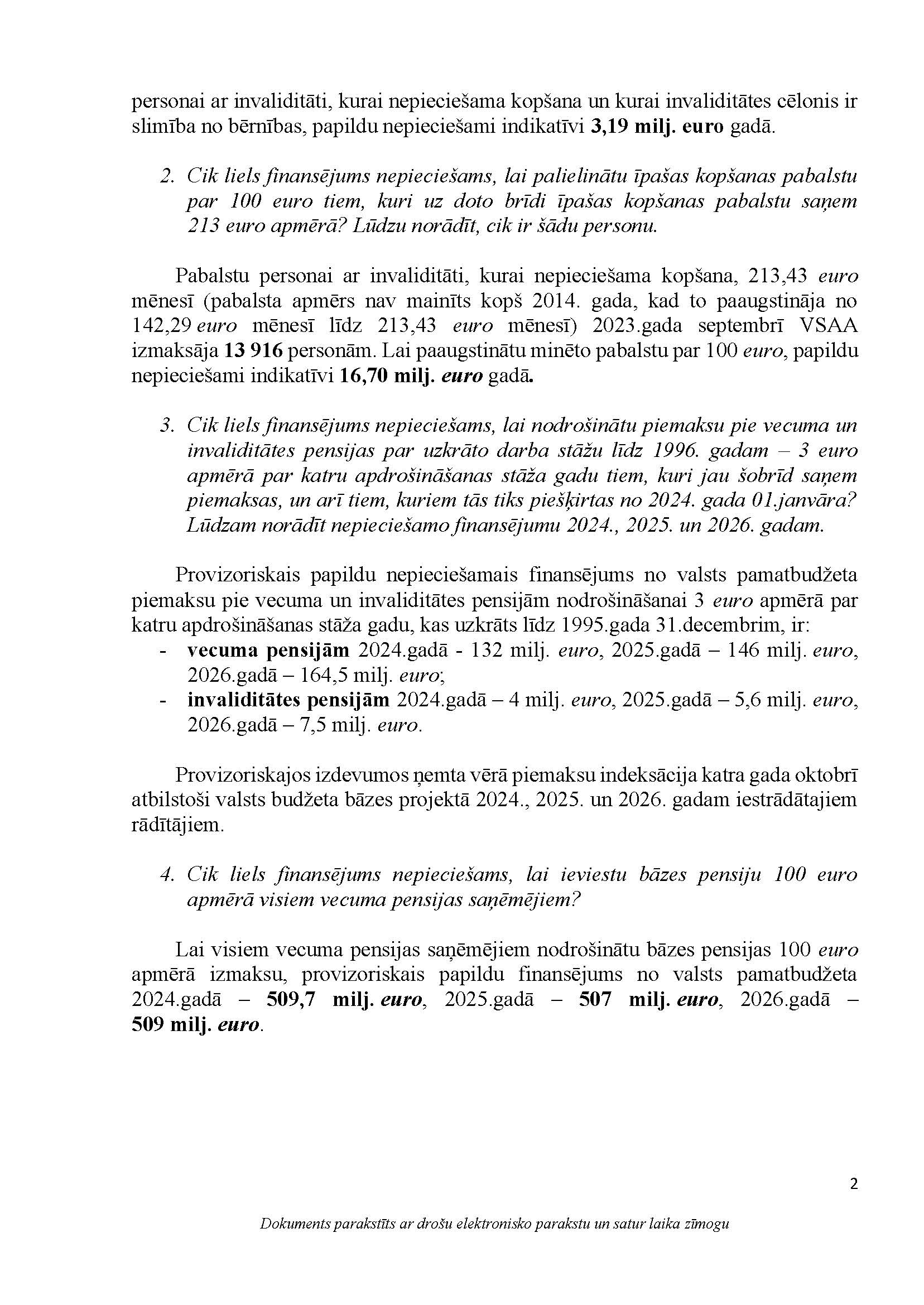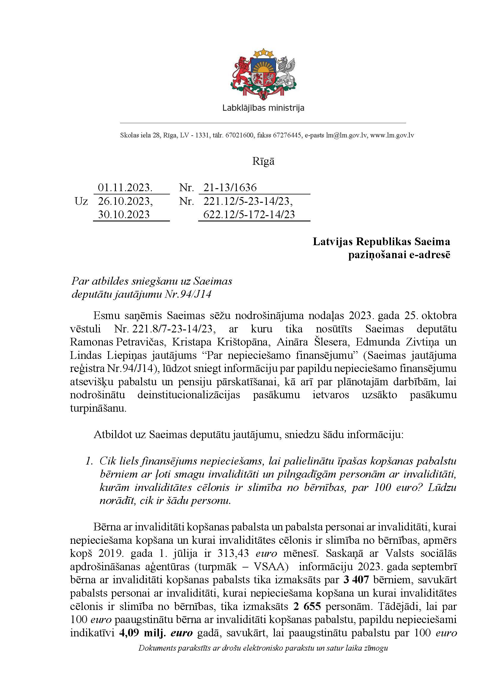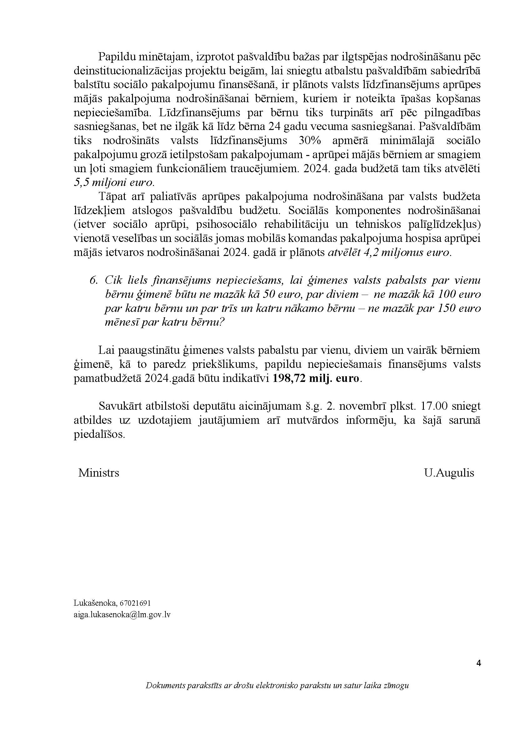 Deputātu Ramonas Petravičas, Kristapa Krištopana, Aināra Šlesera, Edmunda Zivtiņa un Lindas Liepiņas jautājums labklājības ministram Uldim Augulim "Par nepieciešamo finansējumu". Saņemtā rakstveida atbilde iesniedzējus apmierina.