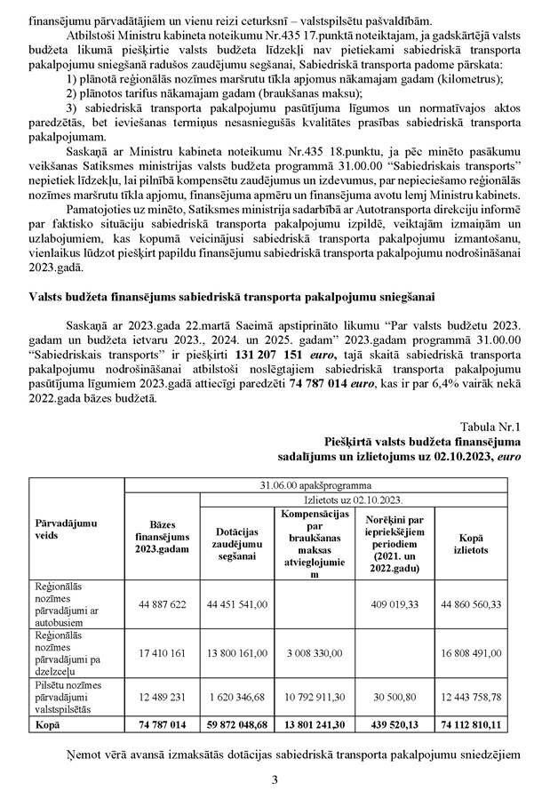Deputātu Edgara Tavara, Jura Viļuma, Andra Kulberga, Aivas Vīksnas un Lindas Matisones jautājums satiksmes ministram Kasparam Briškenam "Par dotāciju zaudējumu segšanai sabiedriskā transporta pakalpojumu sniedzējiem". Saņemtā rakstveida atbilde iesniedzējus neapmierina, bet mutvārdos papildjautājumus viņi uzdot nevēlas.