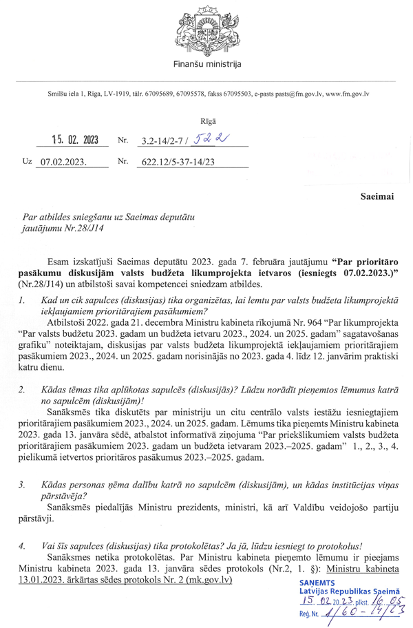 Atbildes uz deputātu jautājumiem 2023. gada 16. februārī