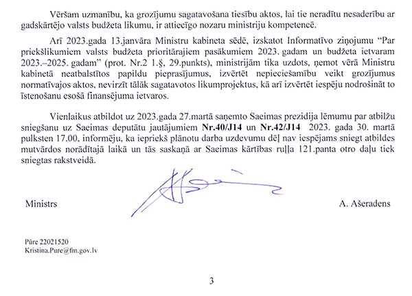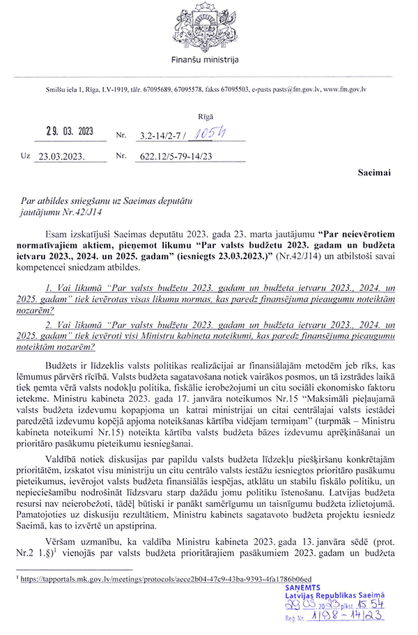 Deputātu Šuvajeva, Švinkas, Briškena, Rasimas un Ņenaševas jautājums finanšu ministram Arvilam Ašeradenam "Par neievērotiem normatīvajiem aktiem, pieņemot likumu "Par valsts budžetu 2023. gadam un budžeta ietvaru 2023., 2024. un 2025. gadam"". Saņemtā rakstveida atbilde iesniedzējus neapmierina, bet mutvārdos papildjautājumus uzdot iesniedzēji nevēlas.