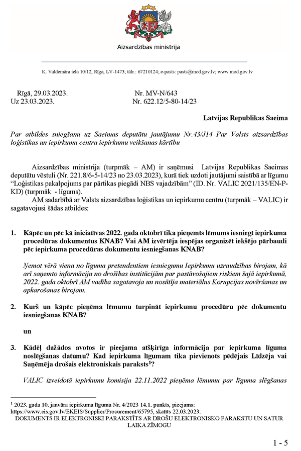 Deputātu Ābramas, Švinkas, Briškena, Simanovskas un Šuvajeva jautājums aizsardzības ministrei Inārai Mūrniecei "Par Valsts aizsardzības loģistikas un iepirkumu centra iepirkumu veikšanas kārtību". Saņemtā rakstveida atbilde iesniedzējus neapmierina, bet mutvārdos papildjautājumus uzdot nevēlas.