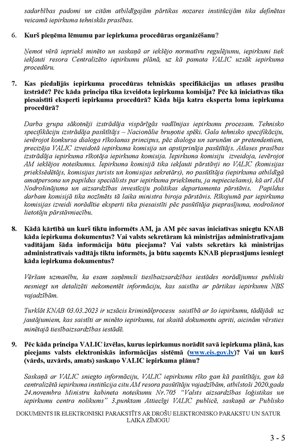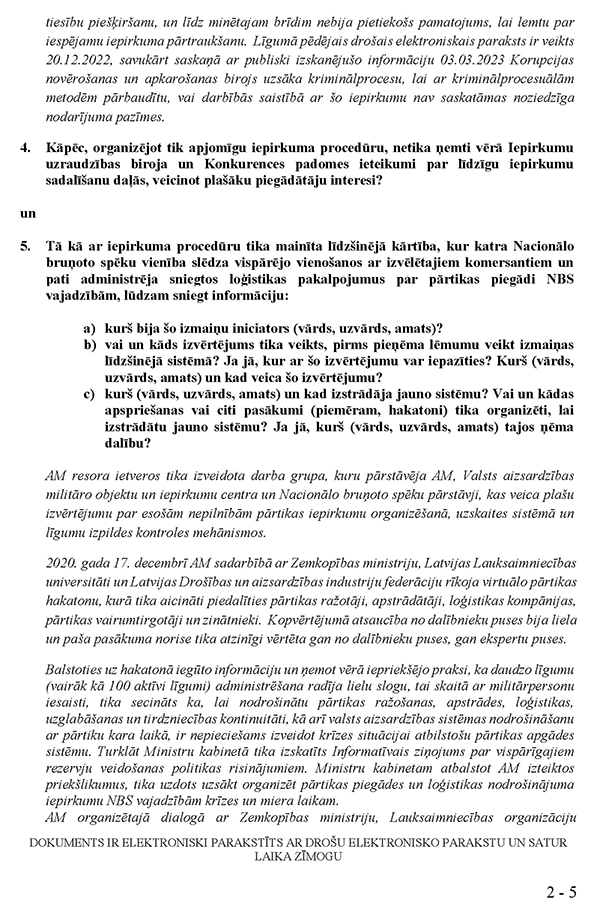 Deputātu Liepiņas, Zivtiņa, Šlesera, Krištopana un Petravičas jautājums aizsardzības ministrei Inārai Mūrniecei "Par pārtikas produktu iegādi Nacionālo bruņoto spēku vajadzībām". Saņemtā rakstveida atbilde iesniedzējus apmierina.