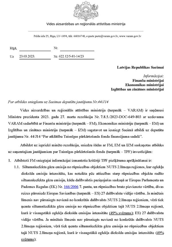 Un pēdējais – deputātu Krauzes, Šlesera, Kūtra, Vucāna un Krištopana jautājums Ministru prezidentam Arturam Krišjānim Kariņam "Par atklātību Taisnīgas pārkārtošanās fonda finansējuma sadalē". Jautājums pāradresēts vides aizsardzības un reģionālās attīstības ministram Mārim Sprindžukam. Saņemtā rakstveida atbilde iesniedzējus neapmierina, bet mutvārdos papildjautājumus uzdot nevēlas.