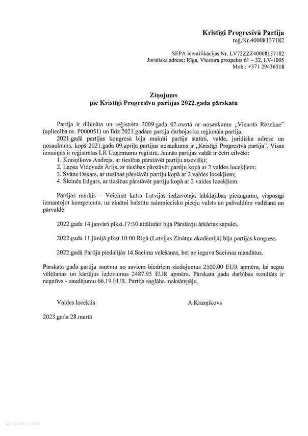 Politiskās partijas "Kristīgi Progresīvā Partija (Vienota Rēzekne)", reģ. Nr. 40008137182, 2022.gada pārskats