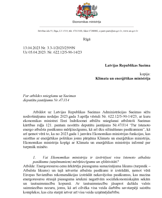 Deputāti Uldis Augulis, Juris Jakovins, Gundars Daudze, Harijs Rokpelnis un Jānis Vucāns ir iesnieguši jautājumu vides aizsardzības un reģionālās attīstības ministram Mārim Sprindžukam "Par Taisnīgas pārkārtošanās fonda atbilstīgu izmantošanu". Jautājums tiek nodots Sprindžuka kungam.